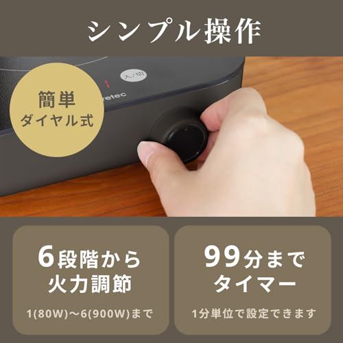 【タイマー付き】6段階の火力調整(80W900W)が、ダイヤルで操作できます。タイマーを99分まで1分単位で設定できます。