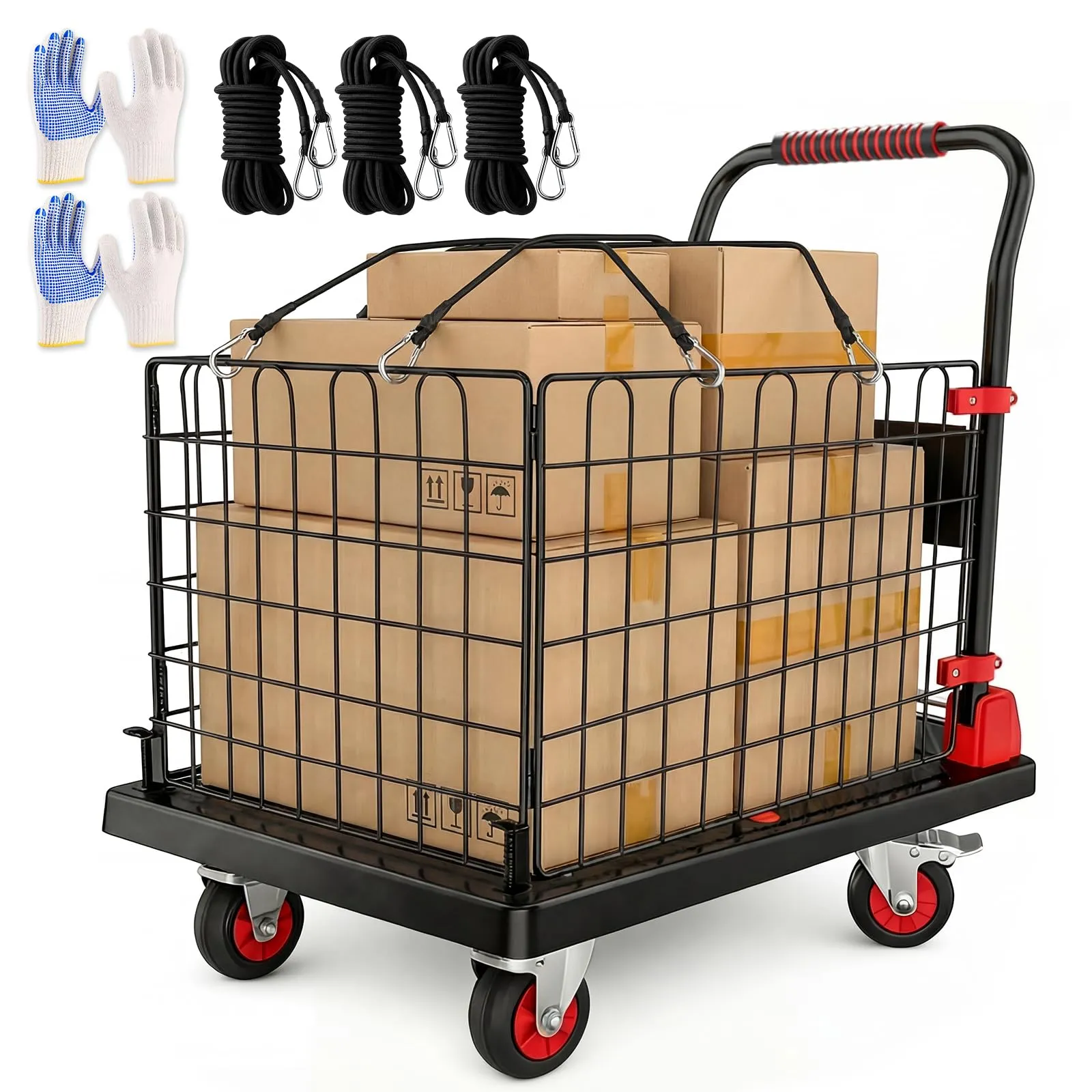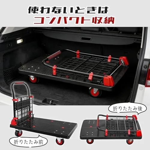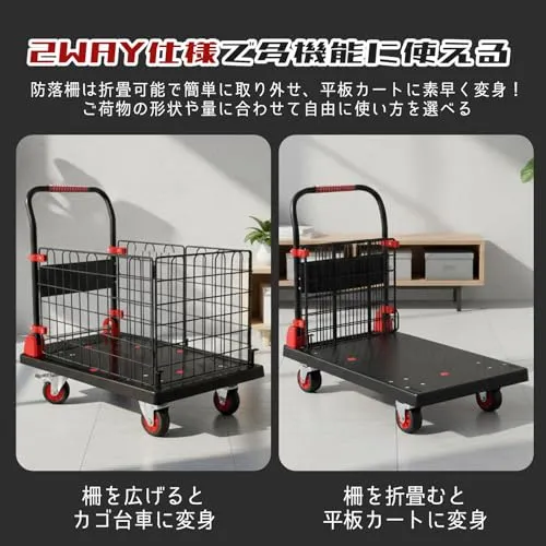 【2WAY仕様カゴ台車&平台車の1台2役】フェンスを立てればカゴ付き台車、折りたためば平台車として使用可能。用途に応じて簡単切替。リヤカー代用としても活躍。荷崩れ防止設計で安定搬送