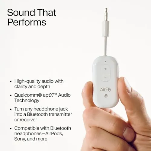 優れたオーディオ品質、低遅延、そしてノイズキャンセル対応 - Bluetooth 5.3とaptX HD Adaptiveに対応したAirFly Pro 2は、安定した高品質の接続と、臨場感あふれるリスニング体験を実現します。クイックアクセス・ボタン・コントロールにより、サウンドの調整やボリュームのミュートが即座に行えます。映画鑑賞やゲームでは、低遅延のオーディオを楽しむことができます。また、AirFly Pro 2は、ユーザーが機内エンターテイメントを楽しむときに、ワイヤレス・イヤホンやヘッドホンのノイズキャンセリング機能に対応するように設計されています。ワイヤレスで、クリアな音質をお楽しみください!