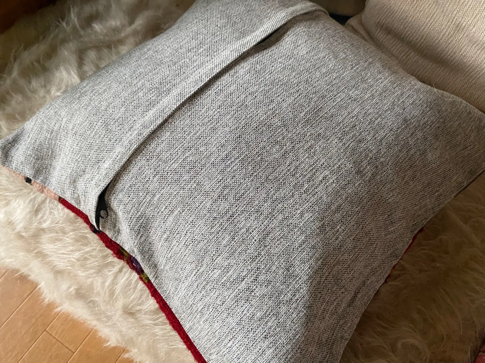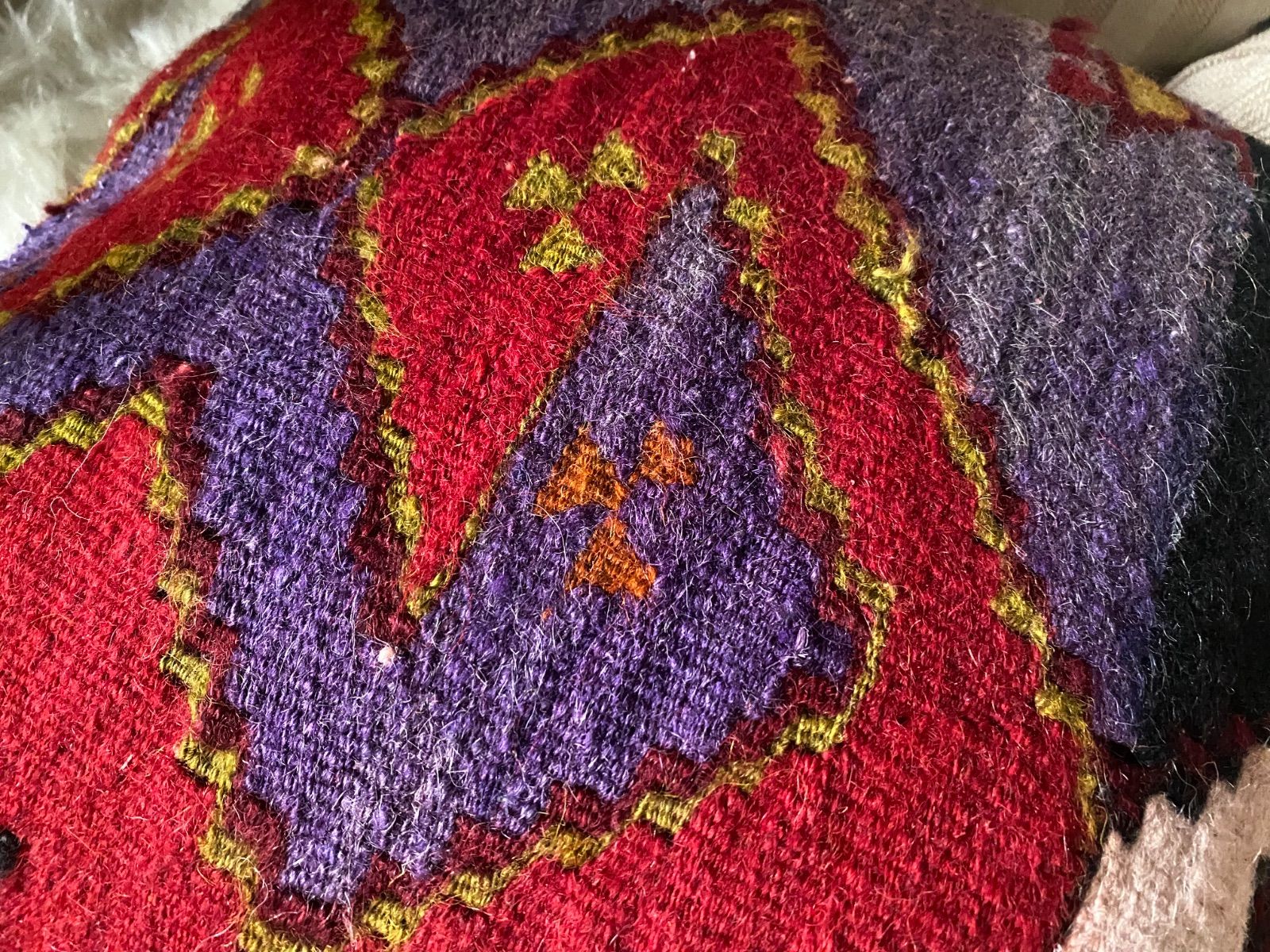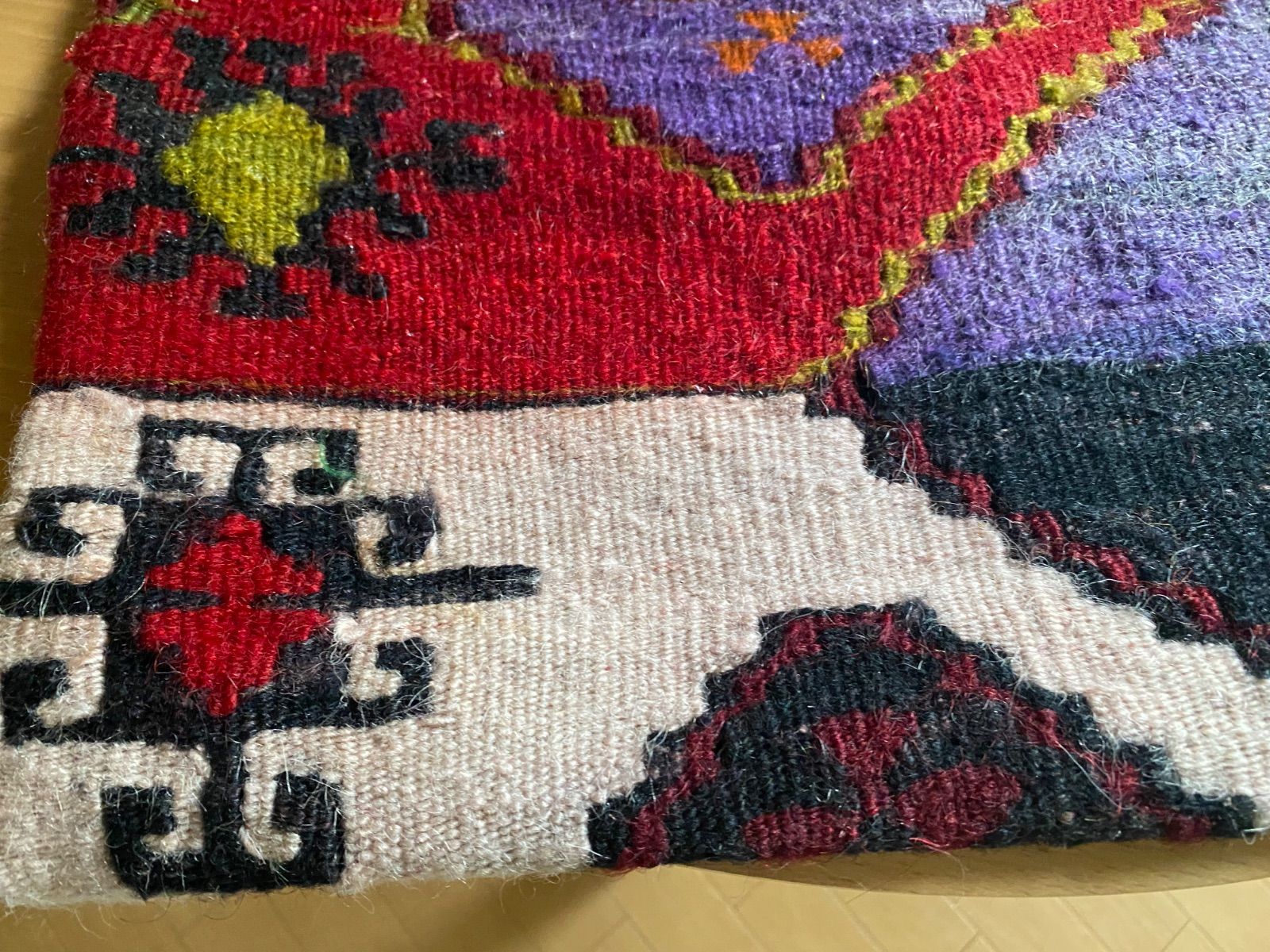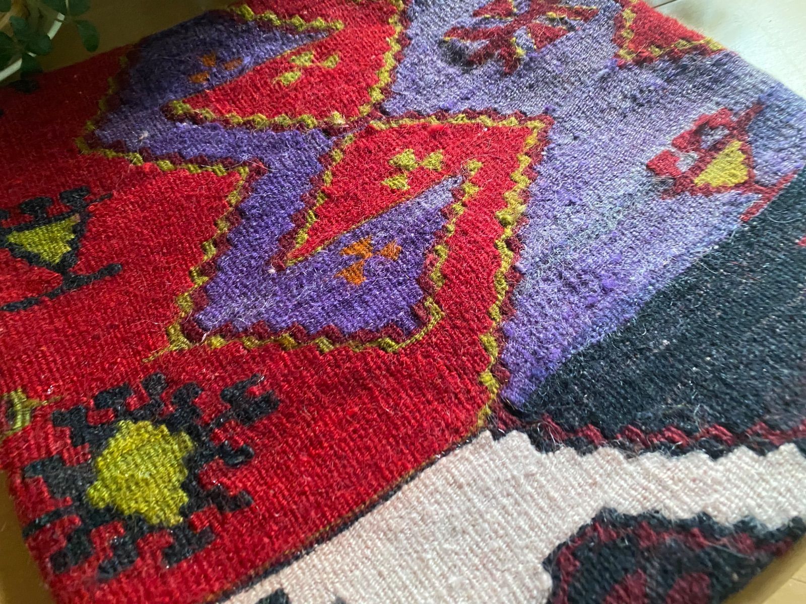オールドキリム~アンティークキリムから作ったカバーには多少の色染みや、修理跡のあるもの、セミアンティークなどは縦糸 が見えているものもございます。