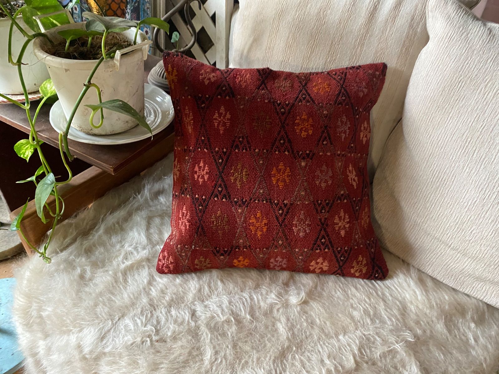 厳選したオールドキリムをカットして作ったカバーです。通常観光地などで販売されているカバーはトルコの絨毯屋で、もう捨てるようなはぎれでつく っておりますのでお安く質もあまりよくないものが多いですが、当店のカバーは一つ一つ厳選したキリムをカットして作っております。