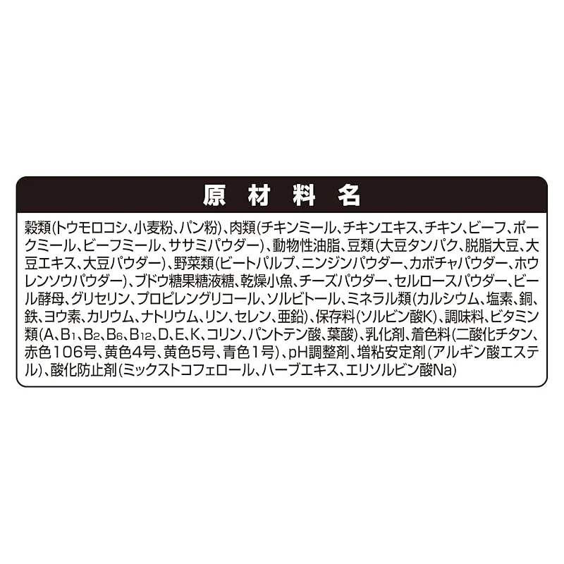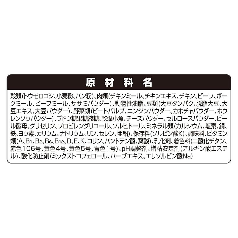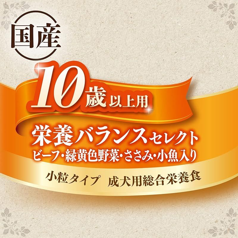 【商品概要】 ドッグフード ドライタイプ 愛犬が大好きな素材を豊富に使用しました グルメなワンちゃんにぴったりな美味しいドライフード 10歳以上の愛犬に適した栄養バランス設計 食感を楽しむ、チーズを加えたささみ入り粒 カルシウムたっぷりの厳選された国産小魚入り 生肉入りの角切りビーフ粒入り ささみ入りの大豆フレーク入り 総合栄養食 原産国 日本