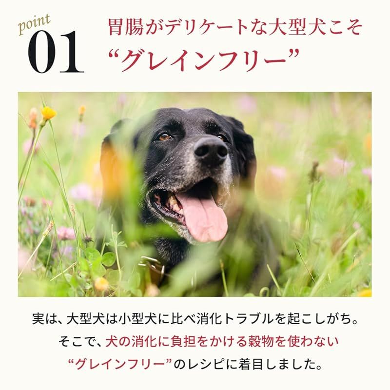 【胃腸がデリケートな大型犬こそ“グレインフリー“】小型犬に比べ、身体全体に対する消化器官の割合が少ない大型犬のために消化に負担のかける穀物を使わない“グレインフリー“のレシピに注目しました。 ?