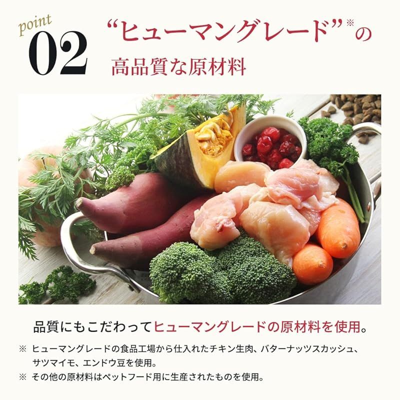 【ヒューマングレード※の高品質な原材料を使用】原材料にたっぷりと入っているチキン生肉や栄養満点のバターナッツスカッシュは人間が食べられるほど新鮮で上質なものを厳選しています。 ※ヒューマングレードの食品工場から仕入れたチキン生肉、バターナッツスカッシュ、サツマイモ、エンドウ豆を使用。 ※その他の原材料はペットフード用に生産されたものを使用。 ?
