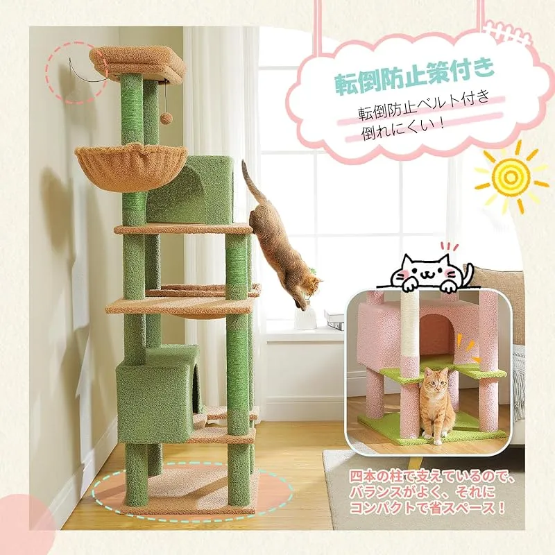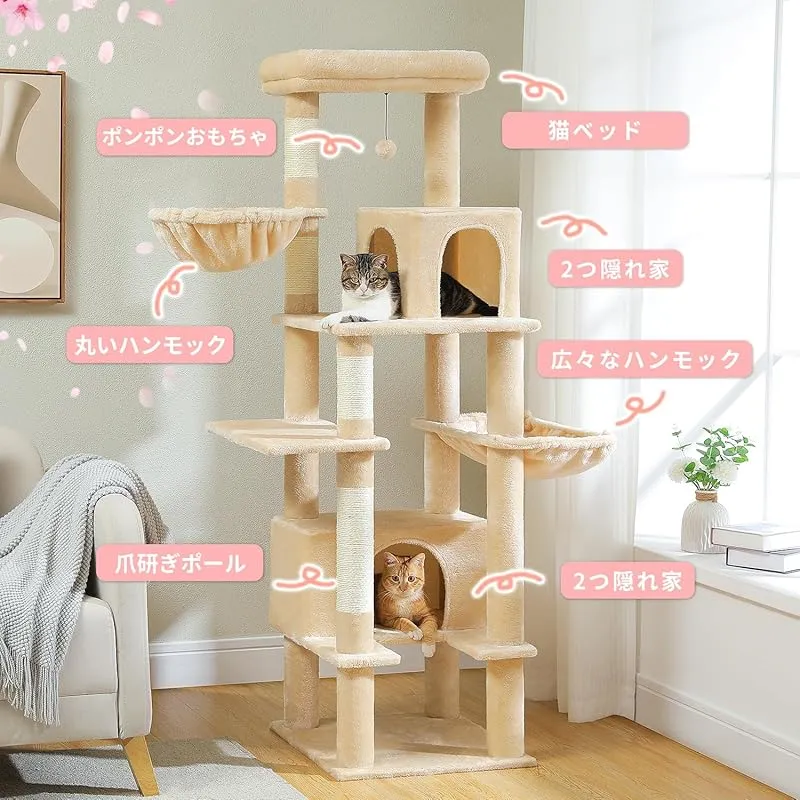 PAWZ Road キャットタワー 多頭飼い 大型猫用 スリム 大型 爪研ぎ 麻紐 ハンモック 据え置き 省スペース 人気 おしゃれ おもちゃ 運動不足 安定 - ベージュ 170cm