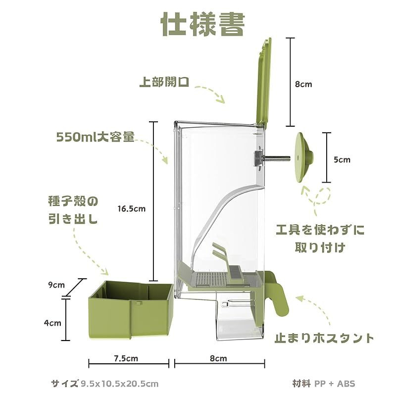 【商品概要】 スタンド付きで設計されており、セキセイインコ、オカメインコ、カナリア、インコなど、小型から中型の鳥たちのニーズにぴったり応えます。 食べ残しのシードは下部の引き出しに簡単に落ちる仕組みで、ケージ内を清潔に保ちます。これにより、散らかる心配がなくなり、日々のお掃除がぐっと楽になります。 この給餌器は、耐久性に優れた高品質なPP素材を使用しており、工具不要で簡単に取り付け可能。手間いらずで時間と労力を節約できます。 上部のフタは簡単に開閉できるデザインで、給餌器全体を取り外す必要がなく、エサの補充がスムーズに行えます。この工夫により、効率的でストレスフリーな給餌が可能です。 最大18オンス(550ml)のエサを収納でき、鳥たちの数日分の食事をしっかり確保できます。