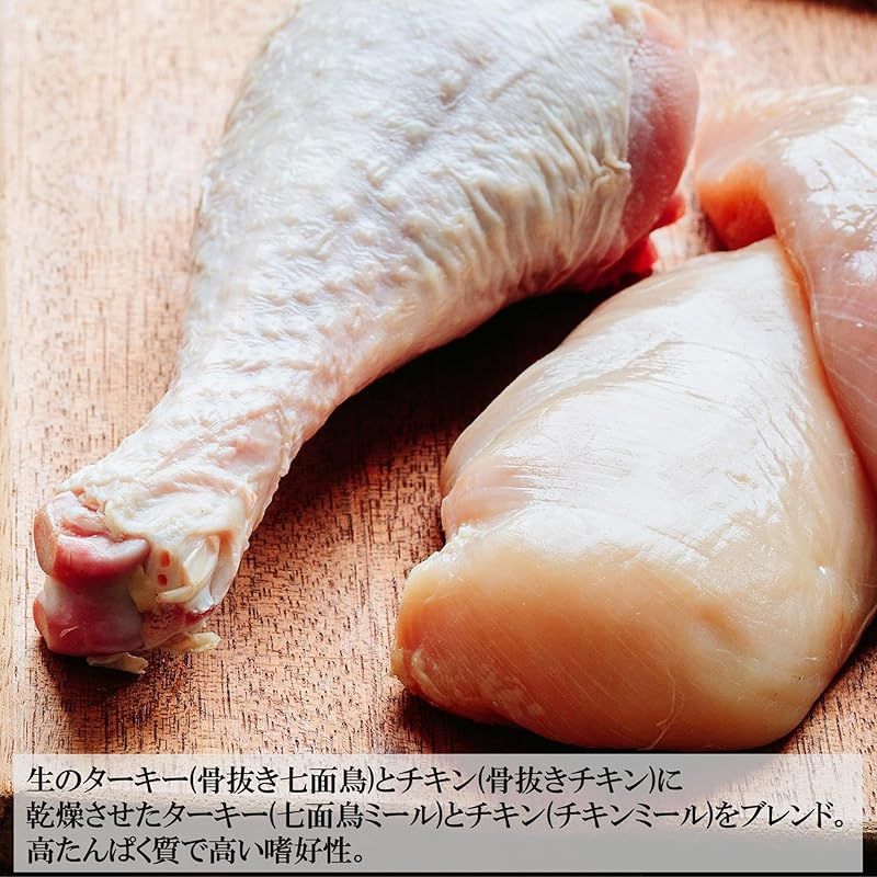 【高たんぱく質な処方】 たんぱく質45.0%以上配合。第一原材料に骨抜き七面鳥(生肉)を使用し、同シリーズの成猫用と比較して約18%たんぱく質を増量。