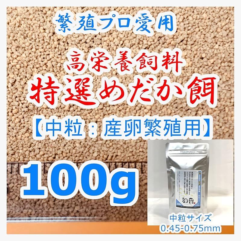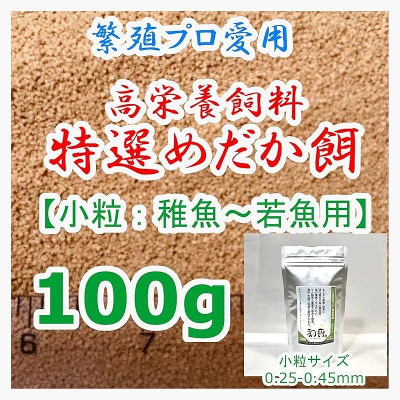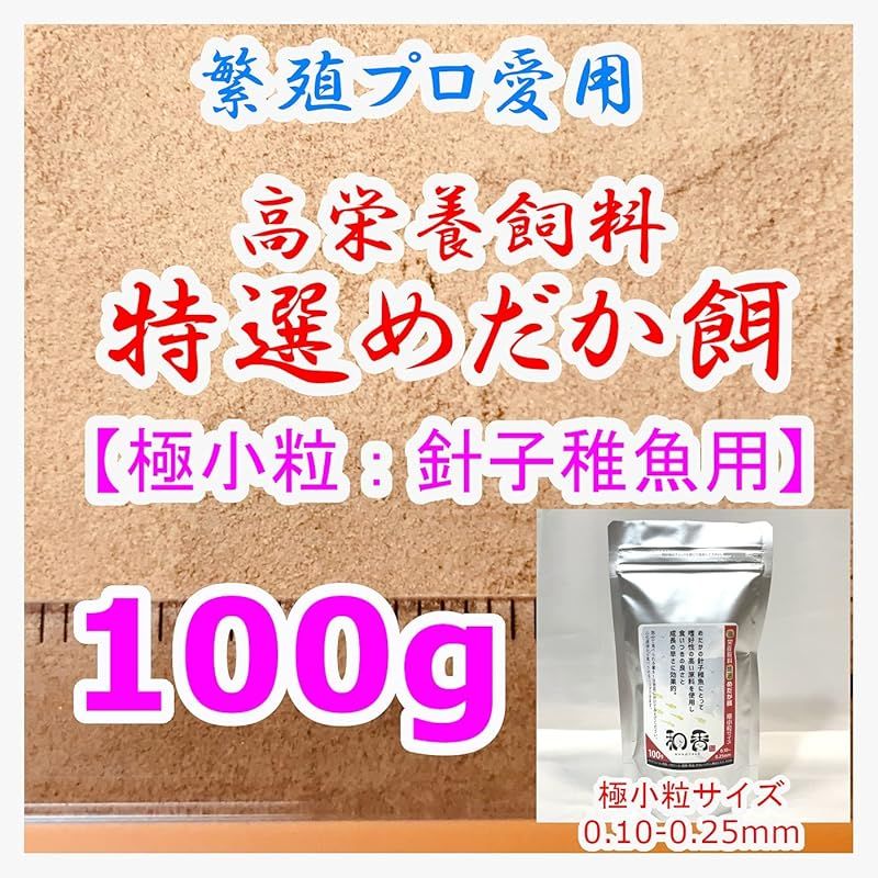 【商品概要】 ★類似品に注意★極小粒サイズは0.10-0.25mm(主に稚魚育成用) 小粒サイズは0.25-0.45mm(稚魚~若魚用) 中粒サイズは0.45-0.75mm(産卵繁殖期用) 食いつきの良さ・成長の早さ・産卵の多さが評判となっていります 成体のめだかにはもちろん、産卵や繁殖時の栄養強化に。水に浮く浮上性の餌の為、めだかが食べやすく、水も汚れにくいです。熱帯魚、グッピー、ベタ、ネオンテトラ、エンゼルフィッシュなどの魚にもおすすめです。