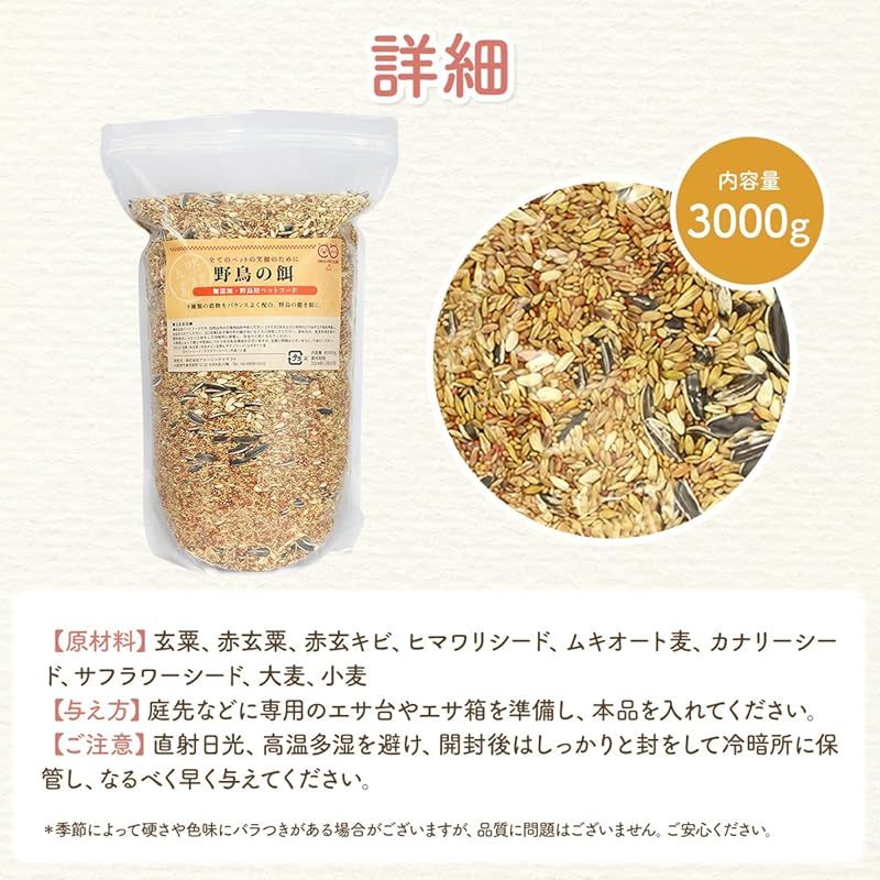 【商品詳細】 ブランド:Sin. 商品種別:鳥用餌 商品名:SMILE PET CLUB 野鳥の餌 3kg (3000g) まき餌 エサ 製造元:アメージングクラフト 商品番号:yatyou 商品内容:3000g