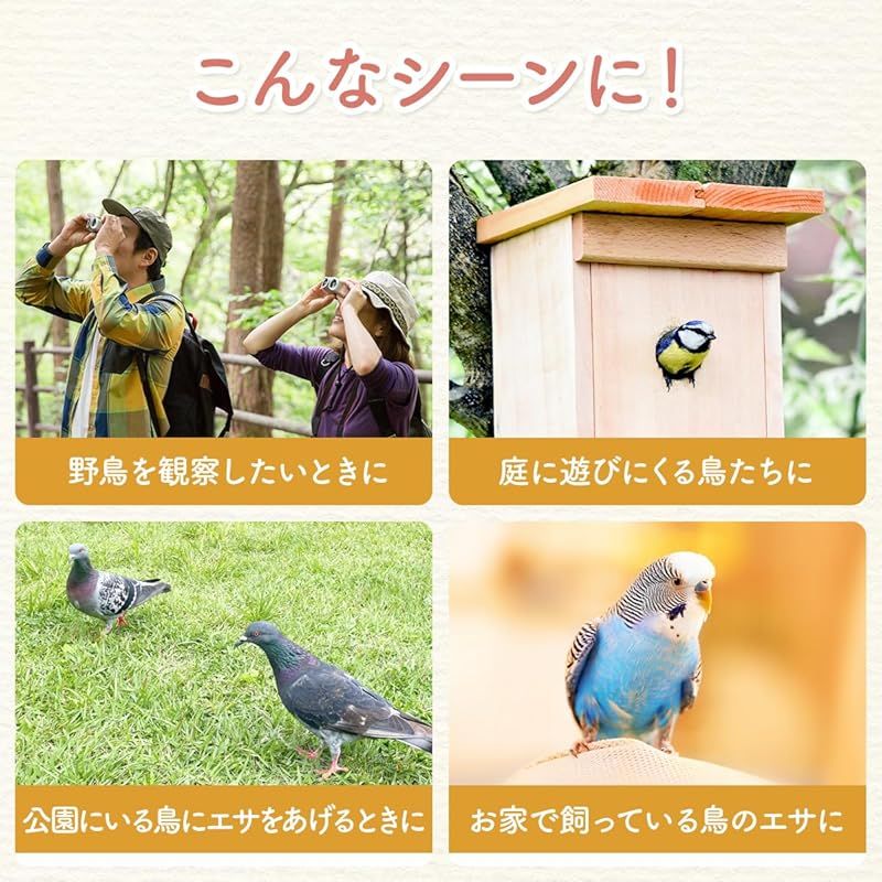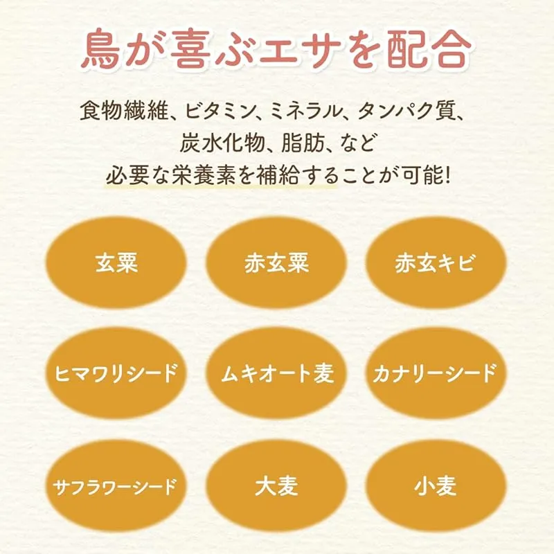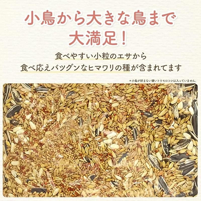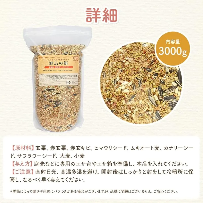 【商品概要】 野鳥用にブレンドしたフードです。 9種の穀物をバランス良く配合しています。 原材料:玄粟、赤玄粟、赤玄キビ、ヒマワリシード、ムキオート麦、カナリーシード、サフラワーシード、大麦、小麦