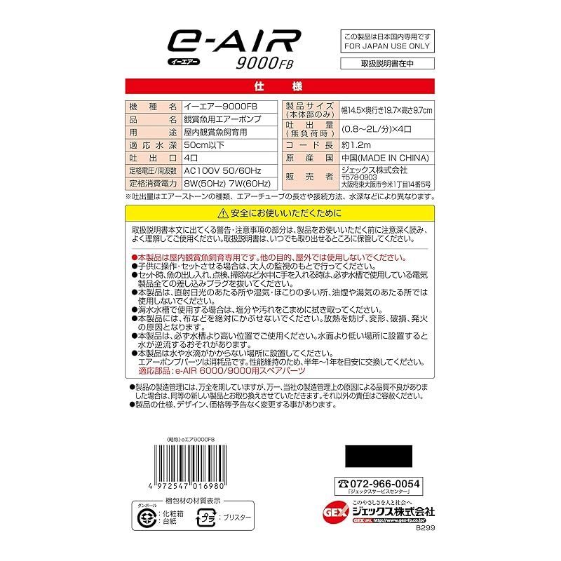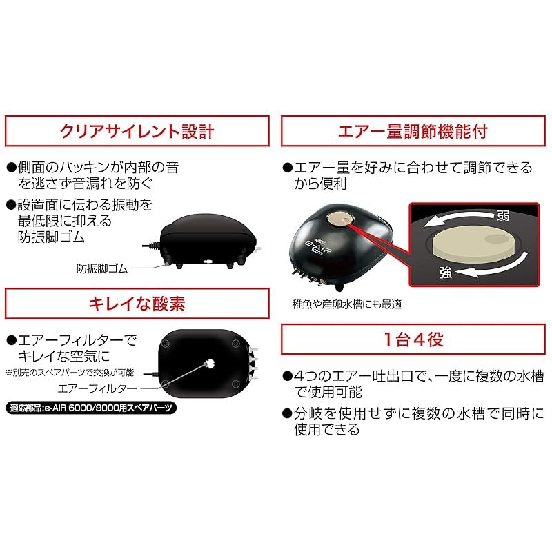 ジェックス GEX AIR PUMP e‐AIR 9000FB 吐出口数4口 8W 水深50cm以下・幅120cm水槽以下 静音エアーポンプ