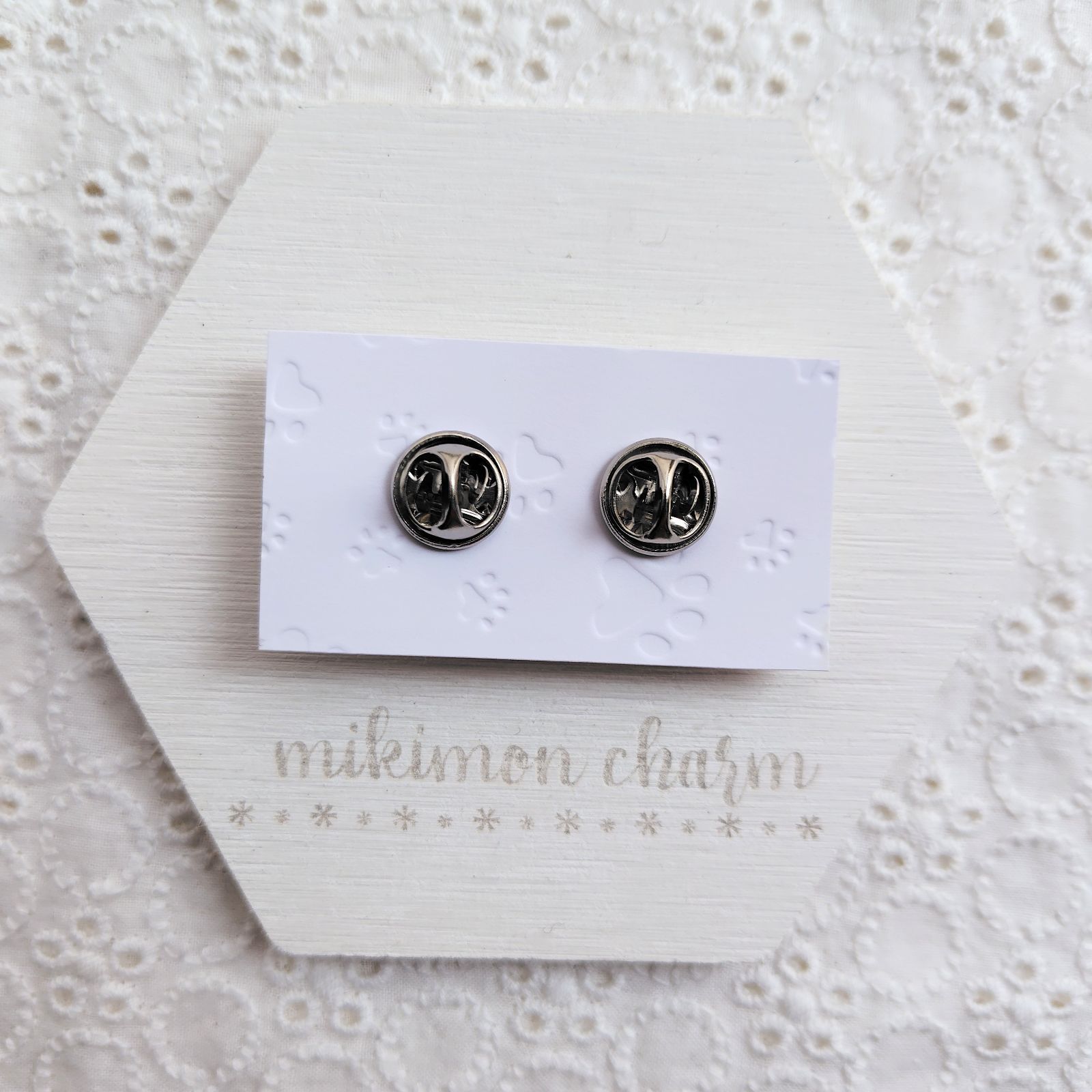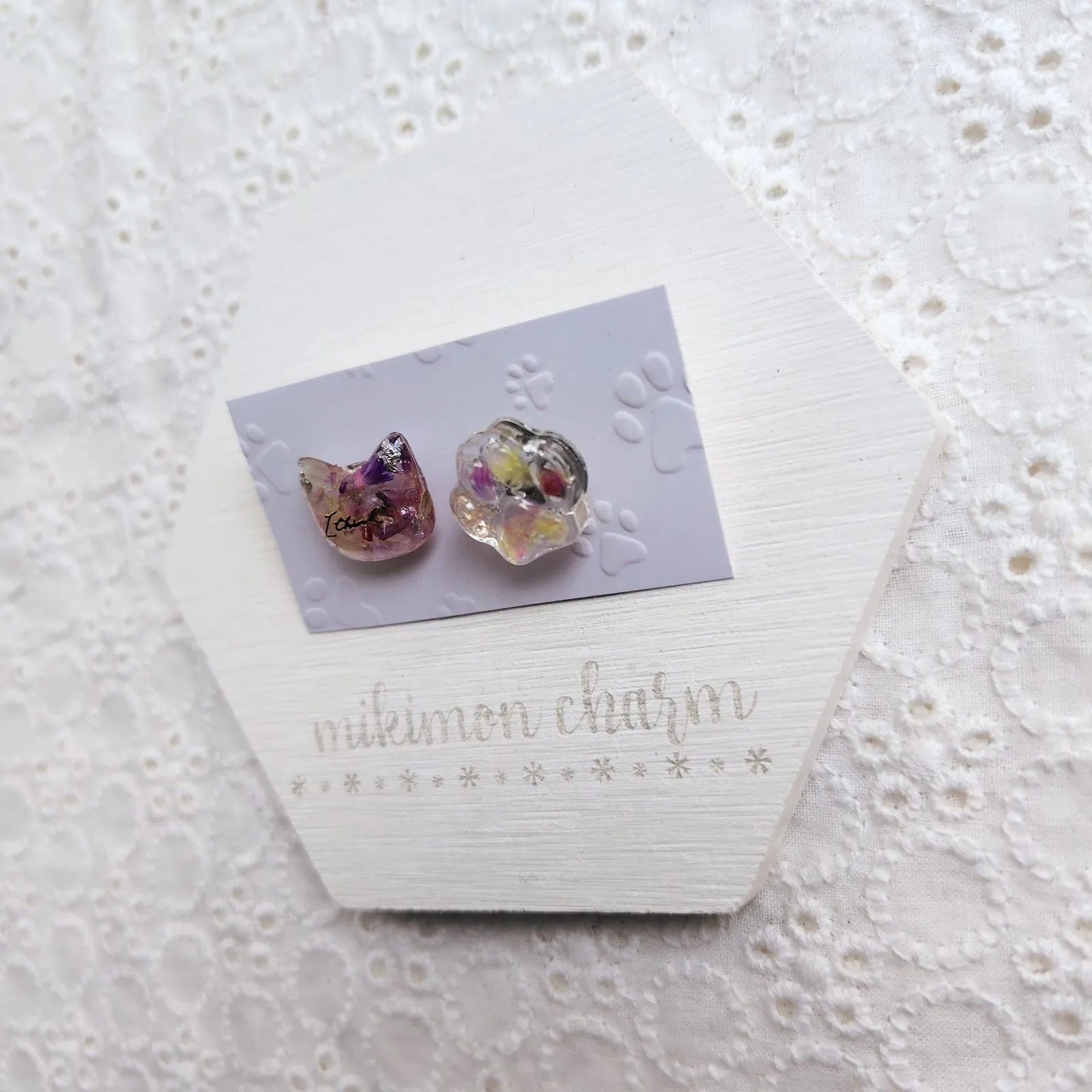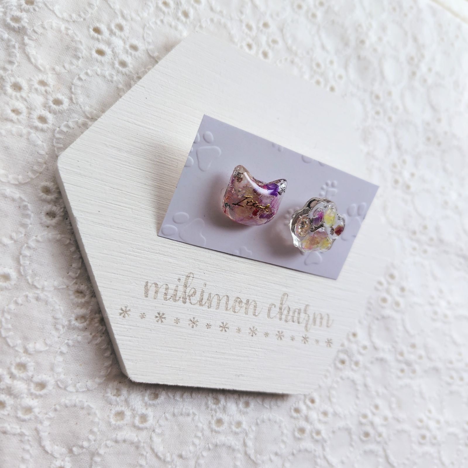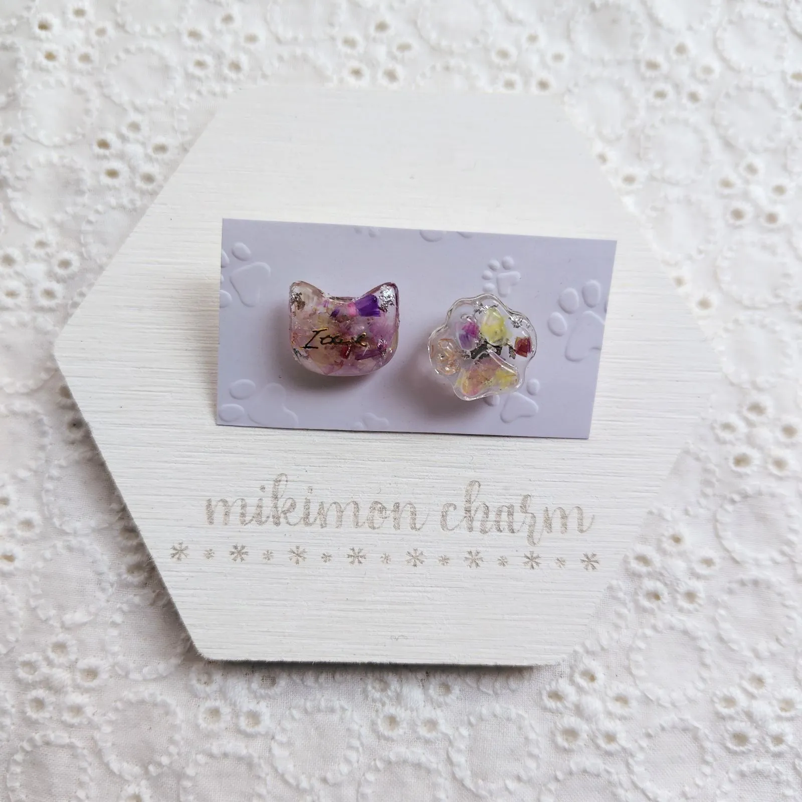 ❁ドライフラワーのスターチスの花びらと銀の箔を封入した猫ちゃん&肉球のピンバッチ2点セットです。猫好きさんにおすすめです❣