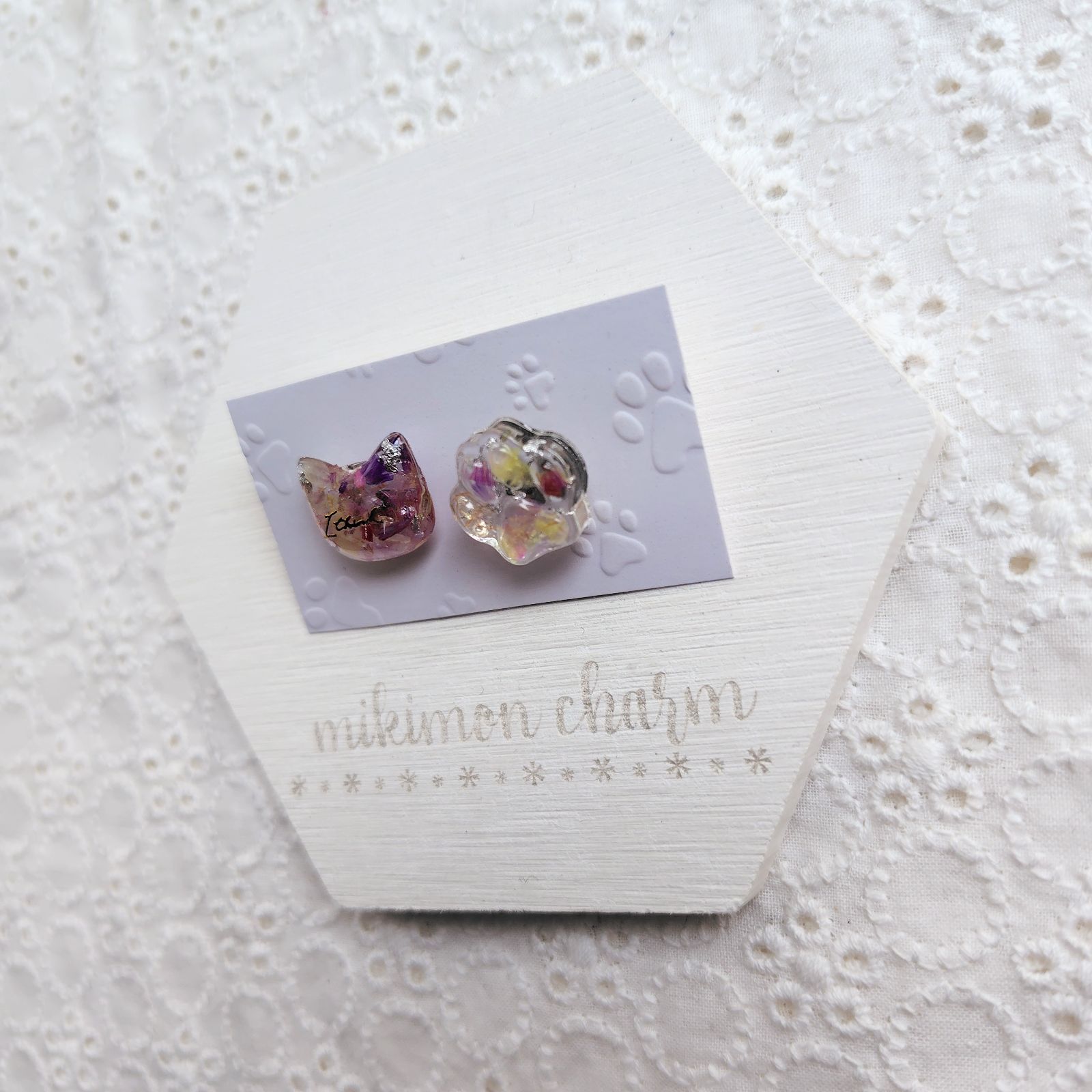 【匿名配送】猫&肉球 ピンバッチ レジン ピンバッジ ドライフラワー 花びら パープル系 紫系 銀の箔