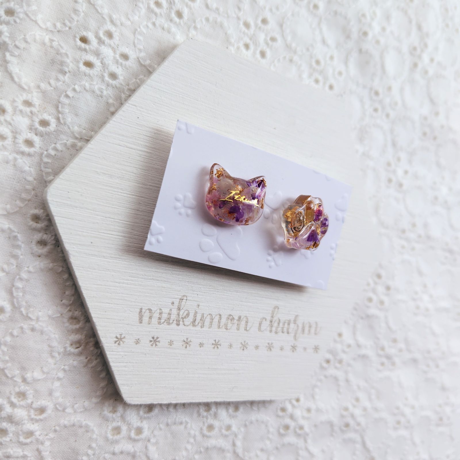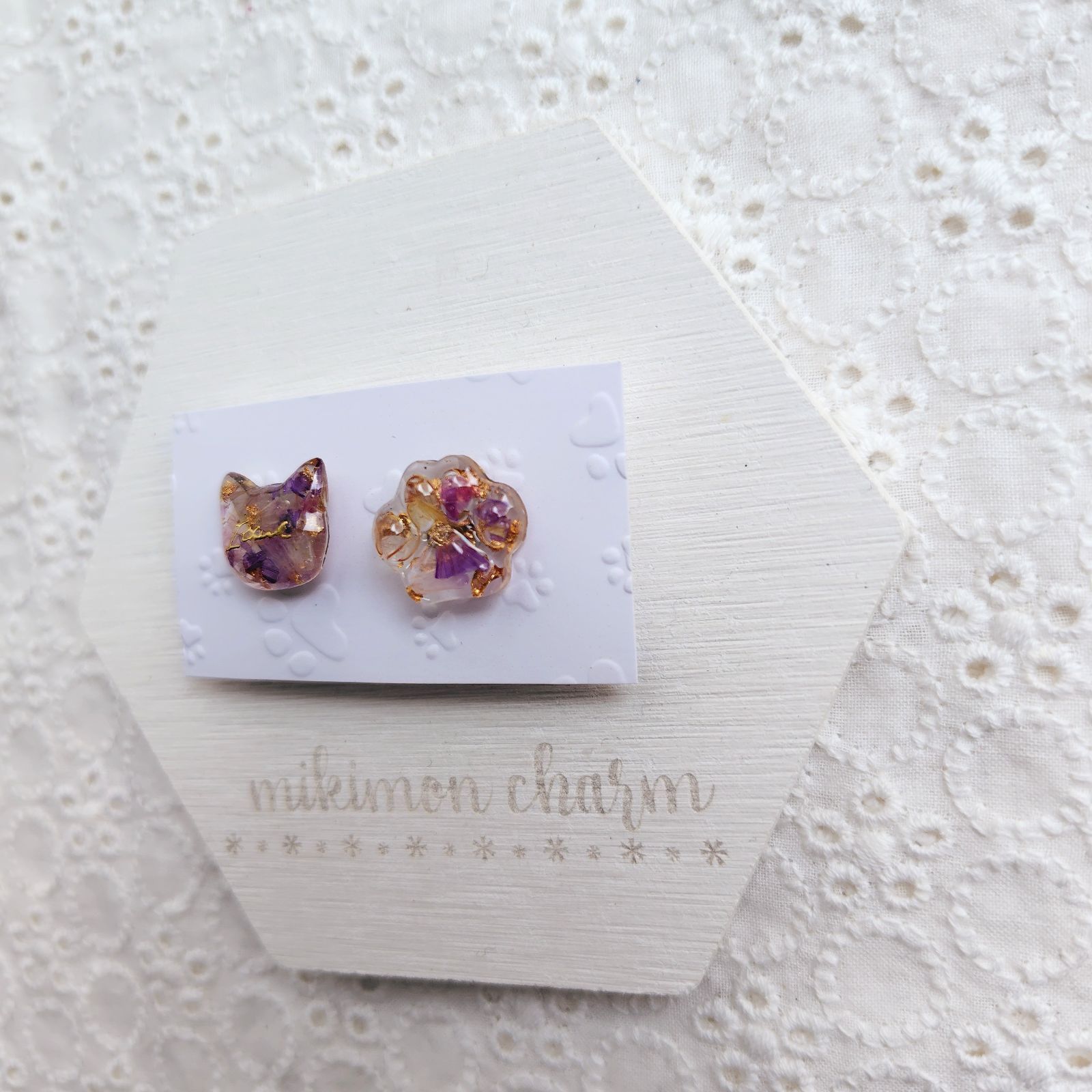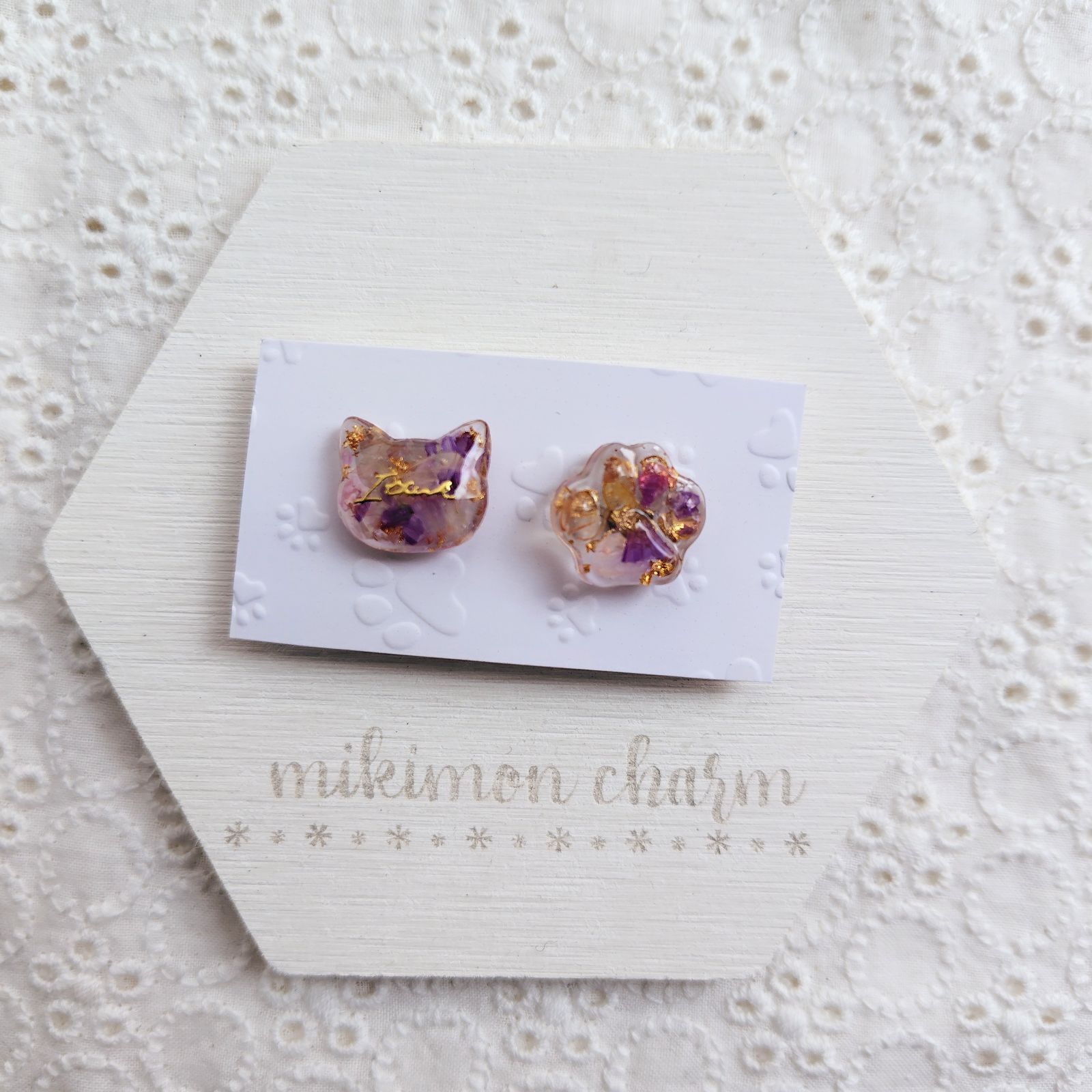 【匿名配送】猫&肉球 ピンバッチ レジン ピンバッジ ドライフラワー 花びら パープル系 紫系 金の箔