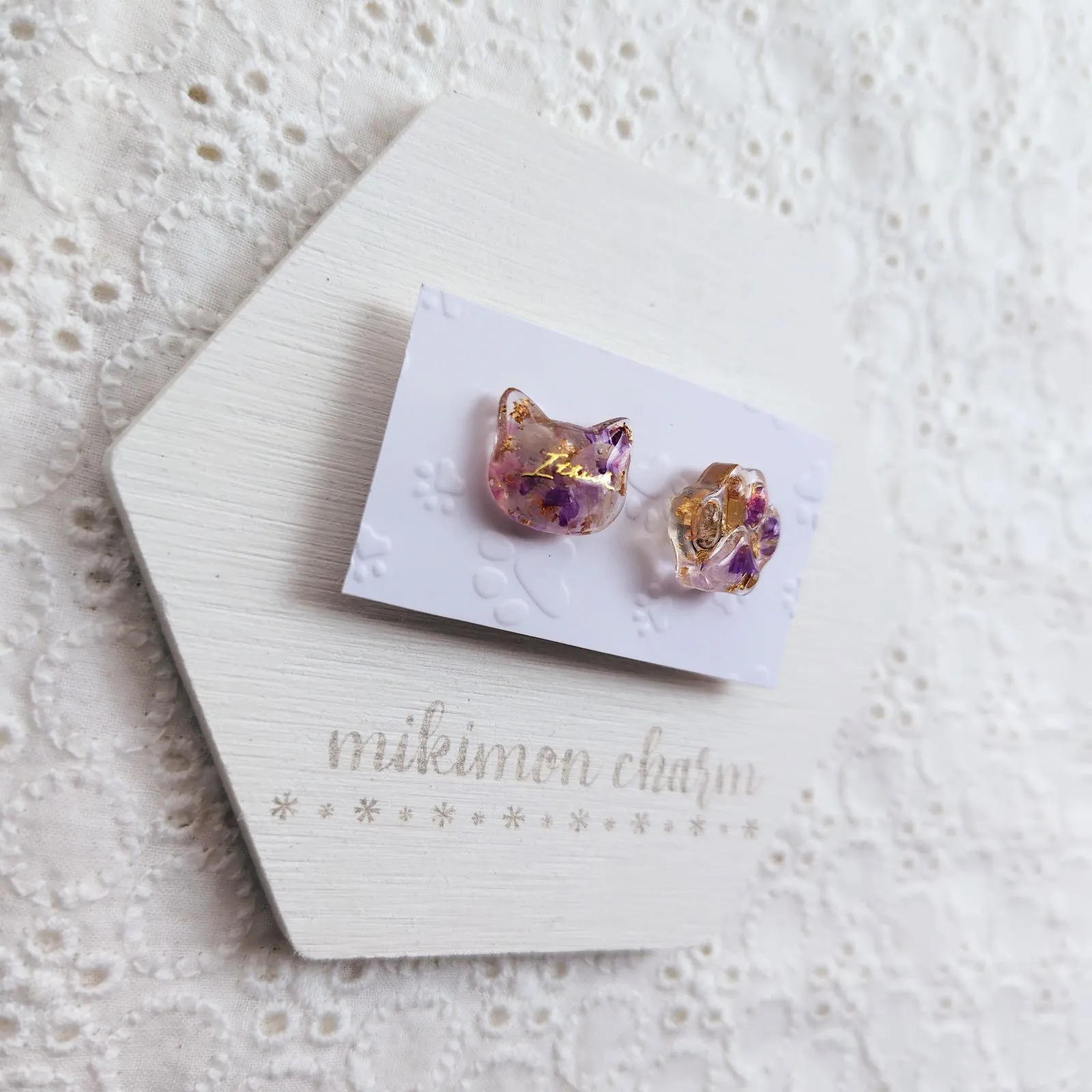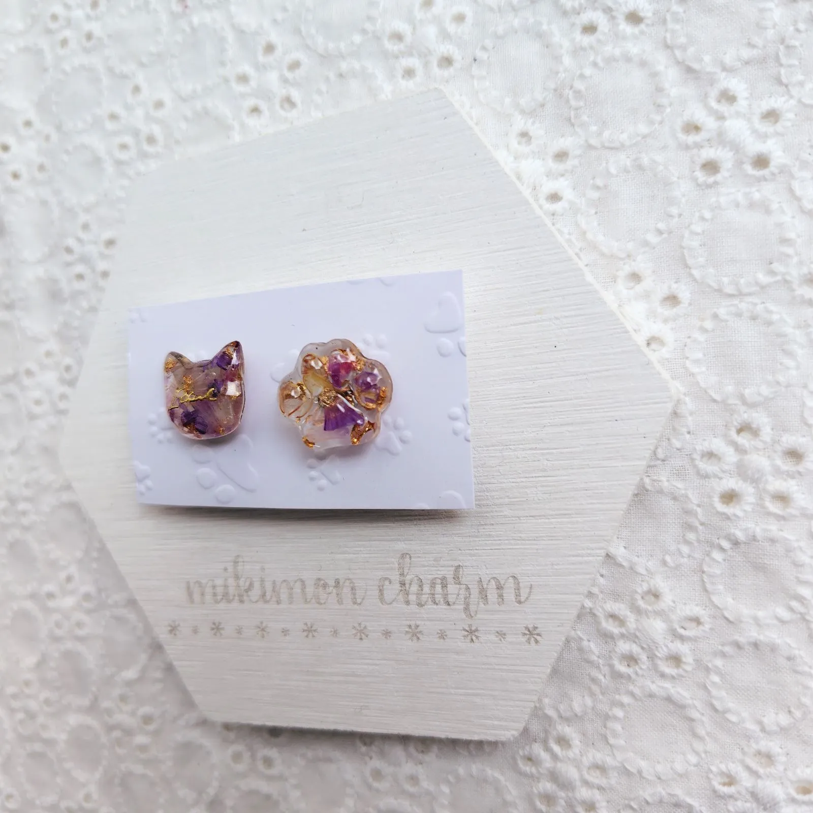 ❁ドライフラワーのスターチスの花びらと金の箔を封入した猫ちゃん&肉球のピンバッチ2点セットです。猫好きさんにおすすめです❣