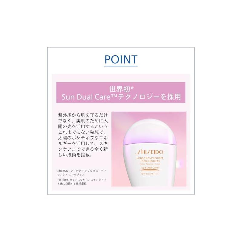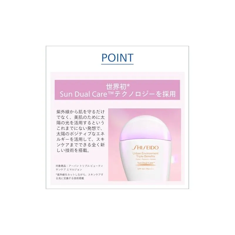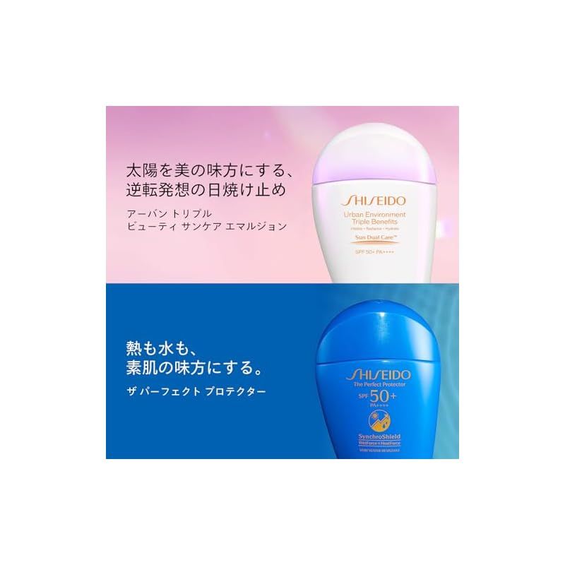 【商品説明】 「販売名:SHISEIDO アーバン トリプル ビューティ サンケア エマルジョン」先進のサンデュアルケアテクノロジーを搭載。 強力な紫外線からの防御と、スキンケアを1本で両立する、革新的な日焼け止め。 独自のスーパーヴェールUV360を搭載し、UVA、UVBはもちろん、チリ・ホコリなどの多様な微粒子から隙なく肌を守ります。 パラベンフリー 環状シリコンフリー オキシベンゾン、オクチノキセートフリー