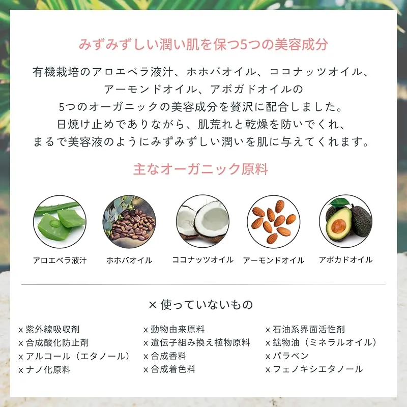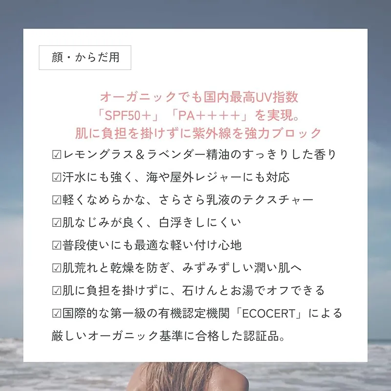 【商品概要】 内容量 50g SPF50+ PA++++ UV耐水性★★ 汗水に強いウォーターレジスタント 天然由来原料100% オーガニック認証品