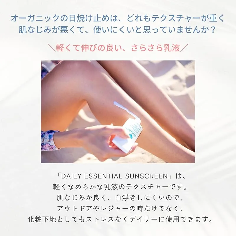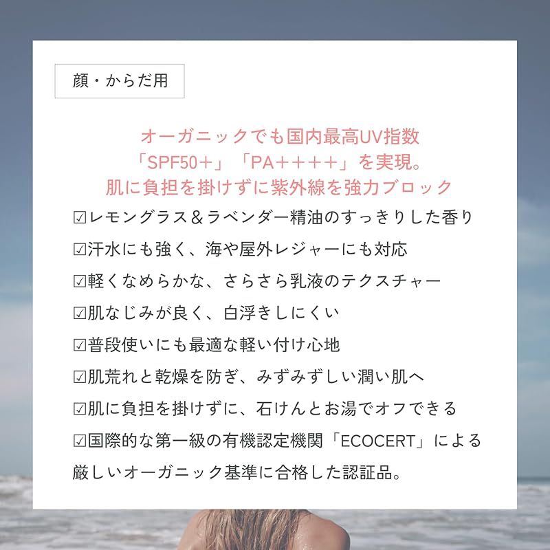 【商品説明】 世界最大規模のオーガニック認証機関である「ECOCERT」の厳しい基準をクリアした肌と地球環境に優しい日やけ止めです。軽く、滑らかで肌なじみの良い乳液のテクスチャーを持ち、100%天然由来成分でノンケミカル&ノンナノでありながら、紫外線防止最大値(SPF50+ PA++++)を実現。オーガニック成分であるアロエベラ液汁、ホホバオイル、アボガドオイル、ココナッツオイル、アーモンドオイル配合により、有害な紫外線をブロックしながら肌に潤いを与えてくれます。肌に負担をかけるあらゆる石油由来合成原料を含まず、敏感肌の方や小さなお子様もお使い頂けます。レモングラスとラベンダー精油が爽やかに香ります。