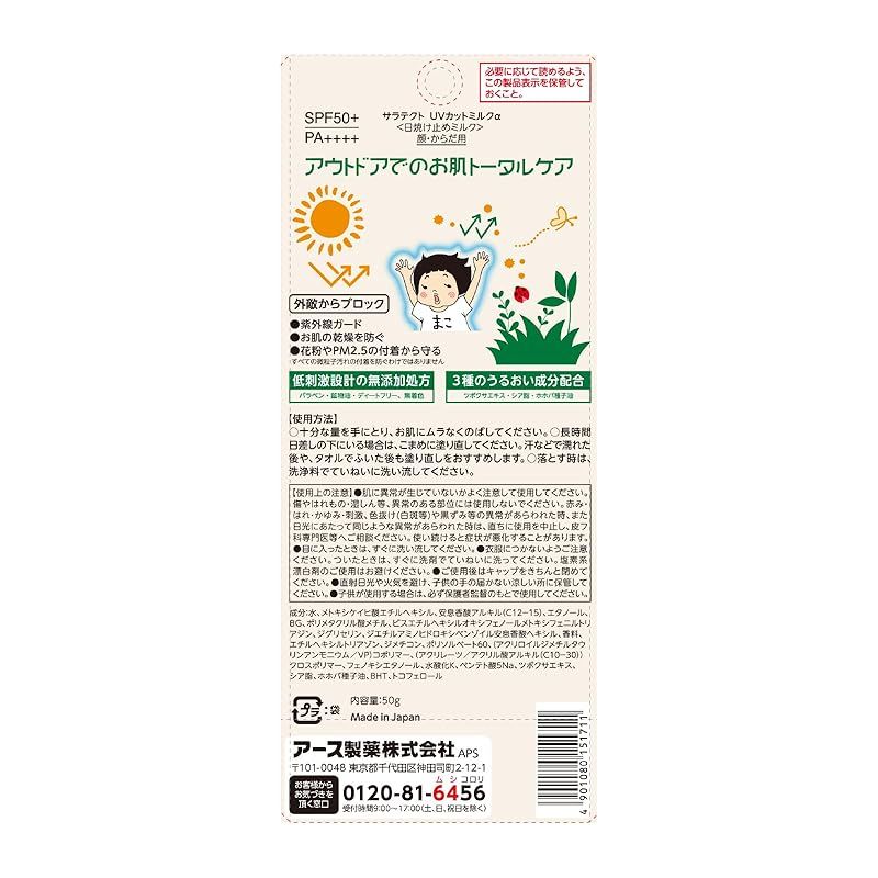 【商品概要】 親子で使える、ミルクタイプの日焼け止め。 おでかけ、キャンプなどのアウトドアでお肌をトータルケアできる日焼け止めミルク。 紫外線ガード:SPF50+、PA++++だから、子供から大人までしっかり紫外線対策。 お肌の乾燥を防ぐ 花粉やPM2.5の付着から守る。花粉対策にも。 ※すべての微粒子汚れの付着を防ぐわけではありません 低刺激設計の無添加処方:パラベン(防腐剤)・鉱物油・ディートフリー、無着色 3種のうるおい成分配合:ツボクサエキス・シア脂・ホホバ種子油