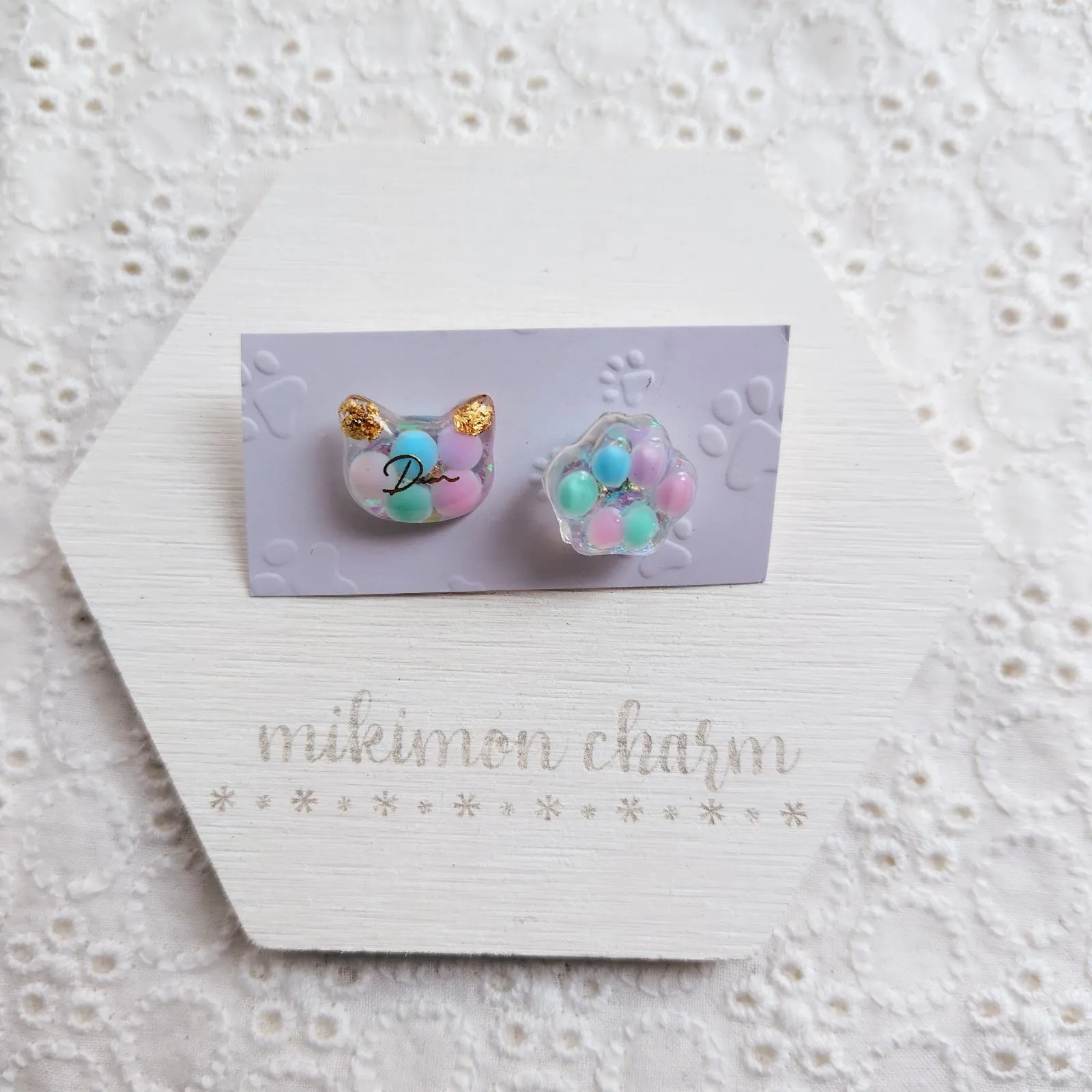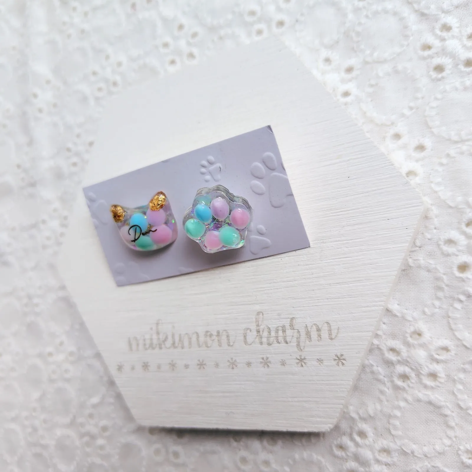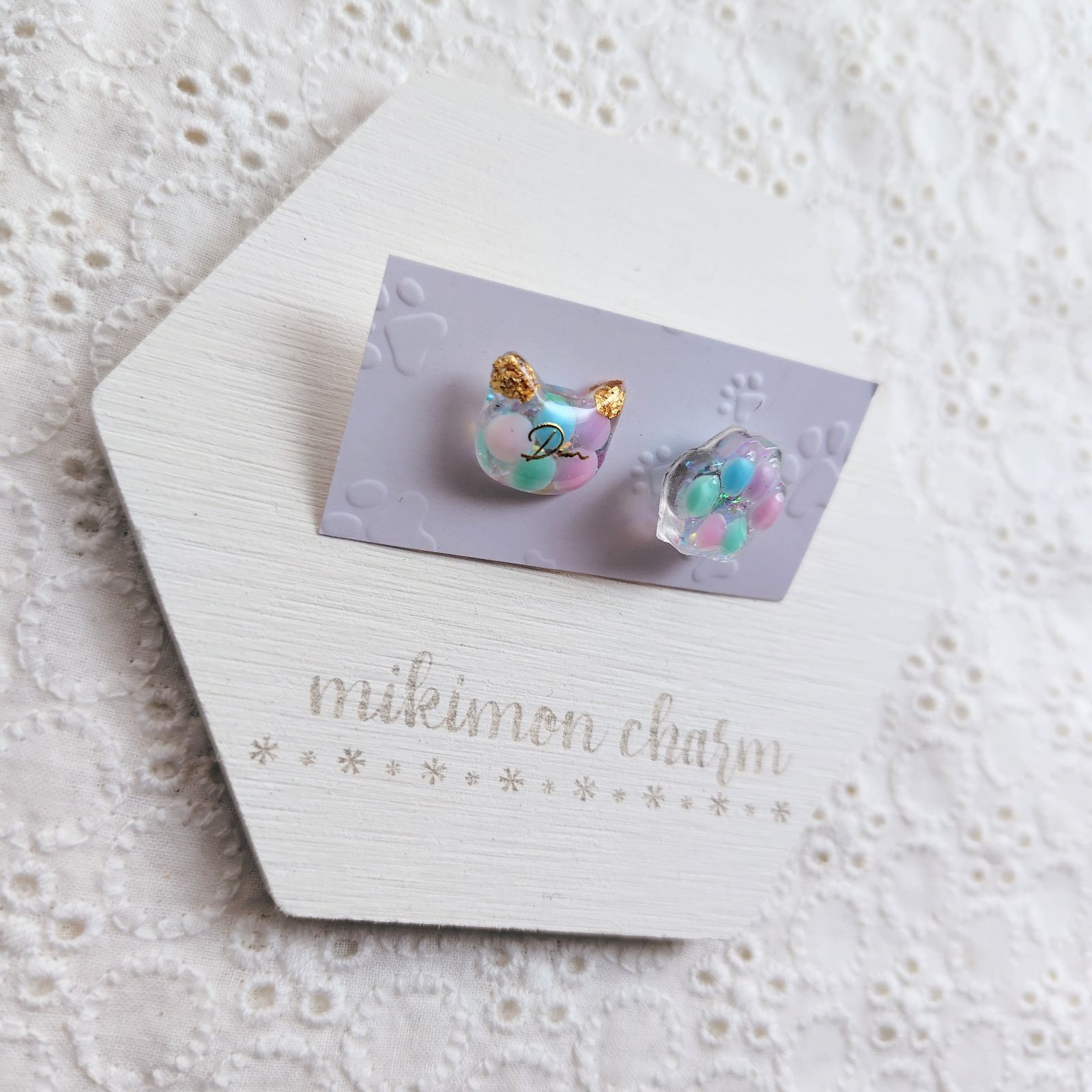 ❁レジンで製作したドットパーツと金の箔、裏側にオーロラホログラムを封入した猫ちゃん&肉球のピンバッチ2点セットです♡