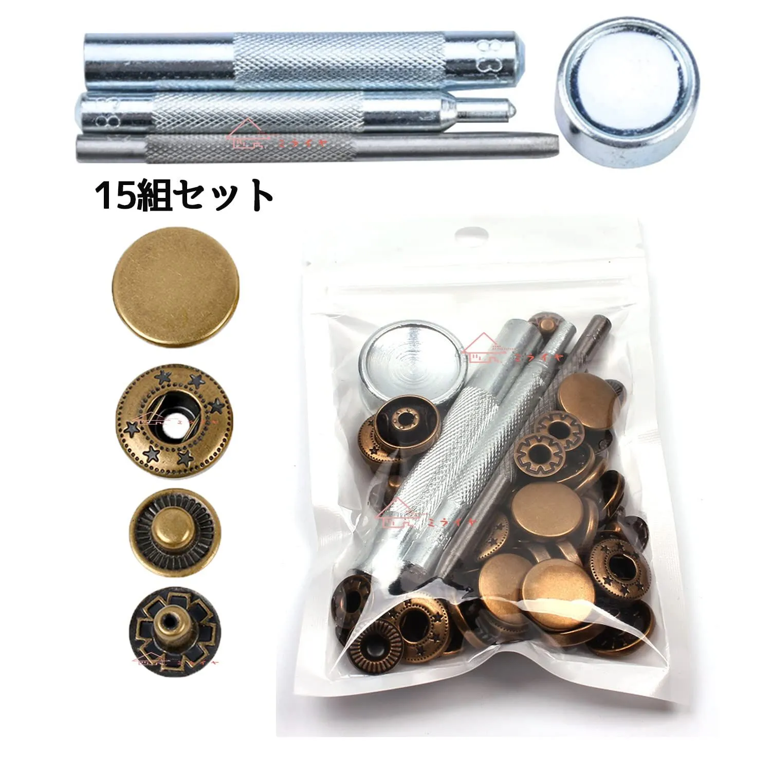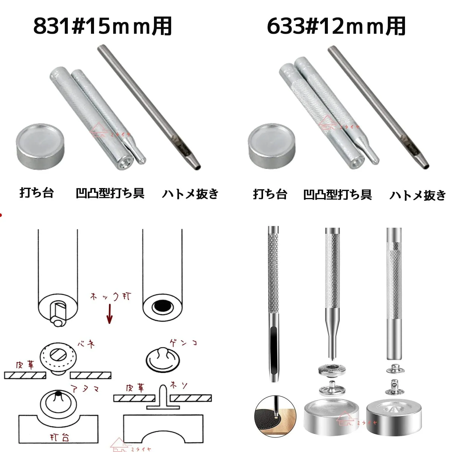 【セット内容】:ホック仕様:バネホック12mm×15組 633#12mm用x2本 ハトメ抜きx1本 打ち台 1個