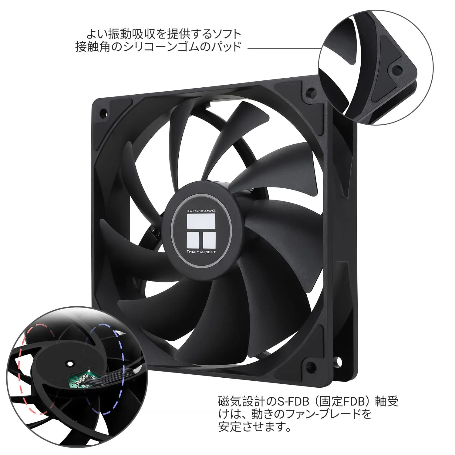 【振動低減と低騒音】を実現 ケースファンの四面には柔らかい素材のシリコンコーナーパッドが搭載され、ファンの回転による振動や摩擦を軽減でき、完璧に騒音を低減し、低騒音で冷却を行うことができます。