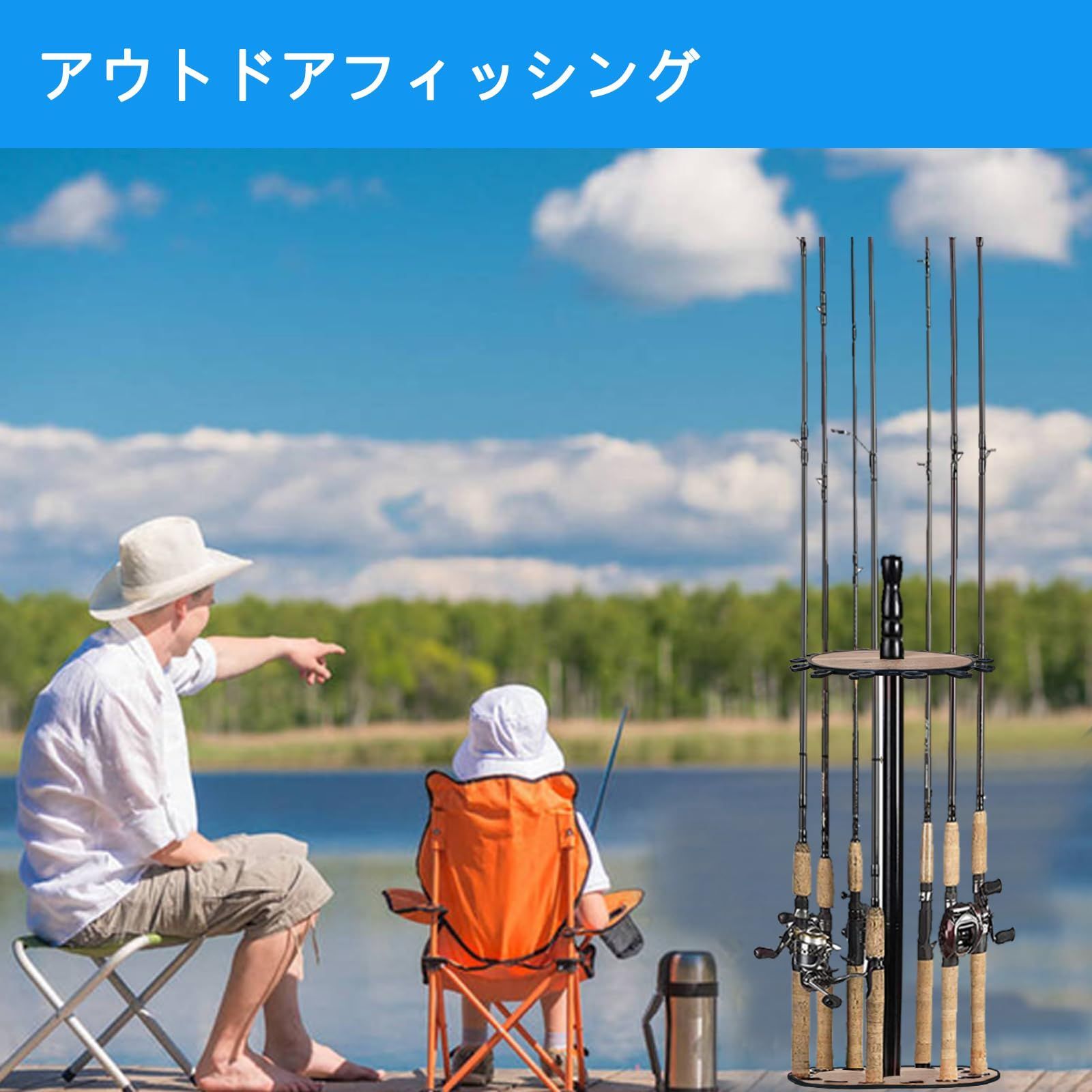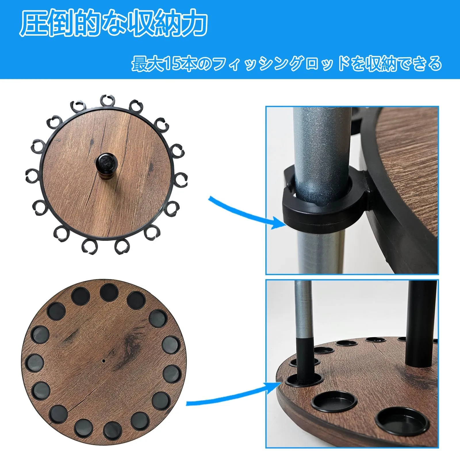 【超省スペース設計】従来の釣竿ホルダーに比べ、面積約0.09平方メートル(円径34cm)、高さ-73cmの最近人気の丸型ロッドホルダーです。 最大釣竿 収納数:釣り竿15本収納可能。 同時に、360 度回転可能なデザインにより、アクセスが容易になり、スペースを最大限に活用できます