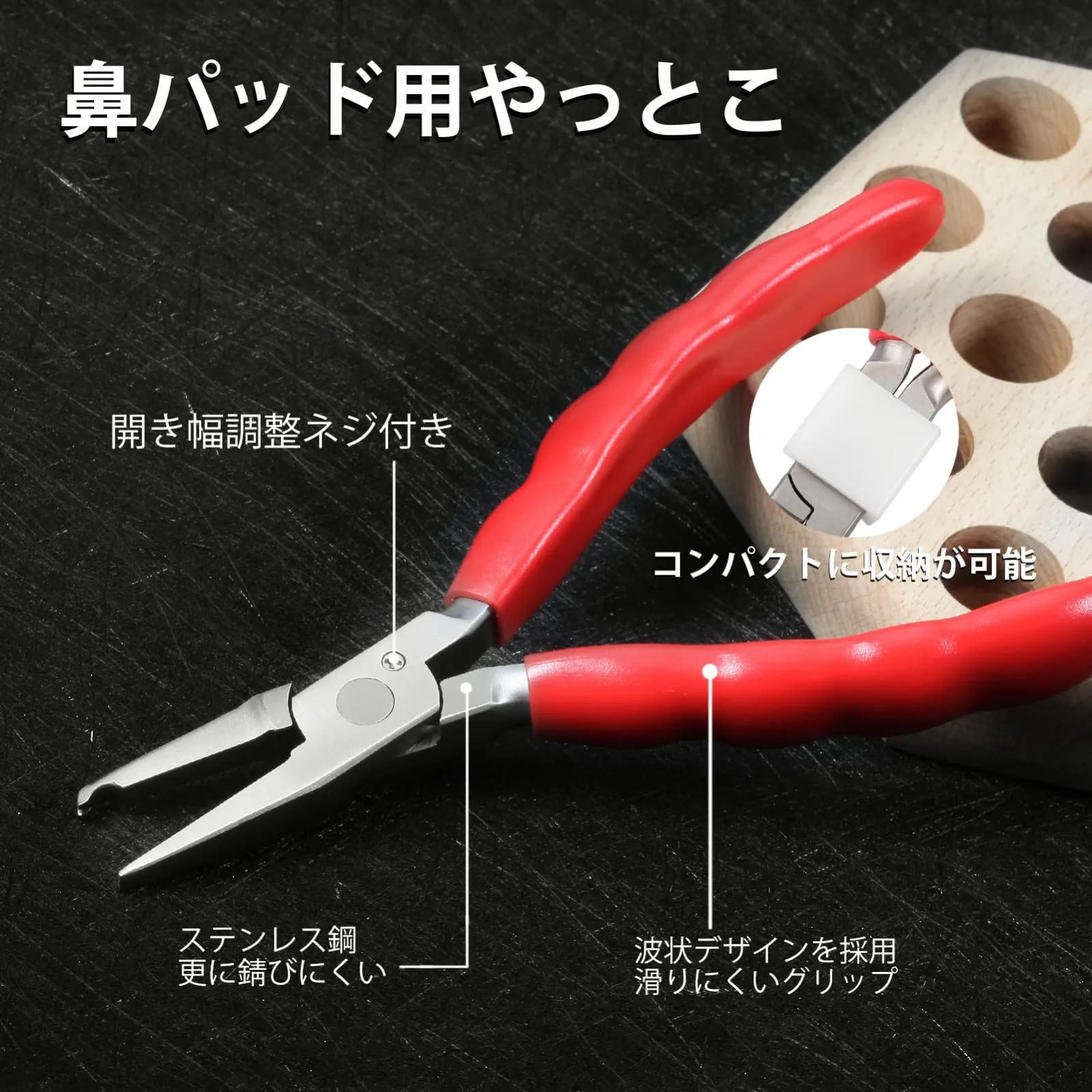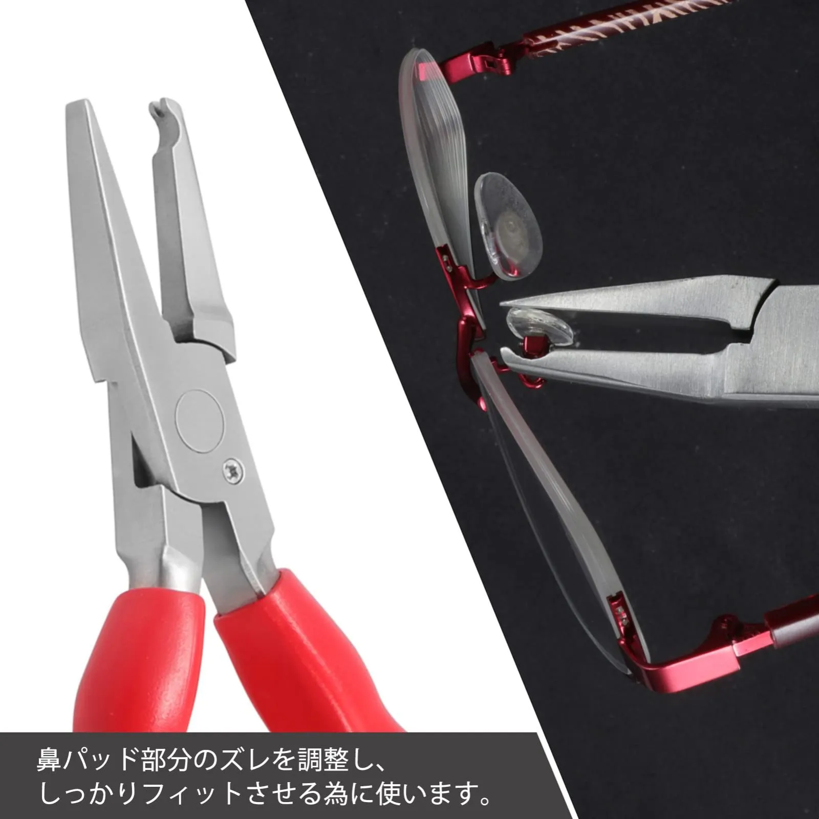 用途:メガネをかけた時に鼻パッド部分のズレを調整し、しっかりフィットさせる為に使います。使い方は、ヤットコのくぼみがある方をネジ部分にフィットさせて調節します。