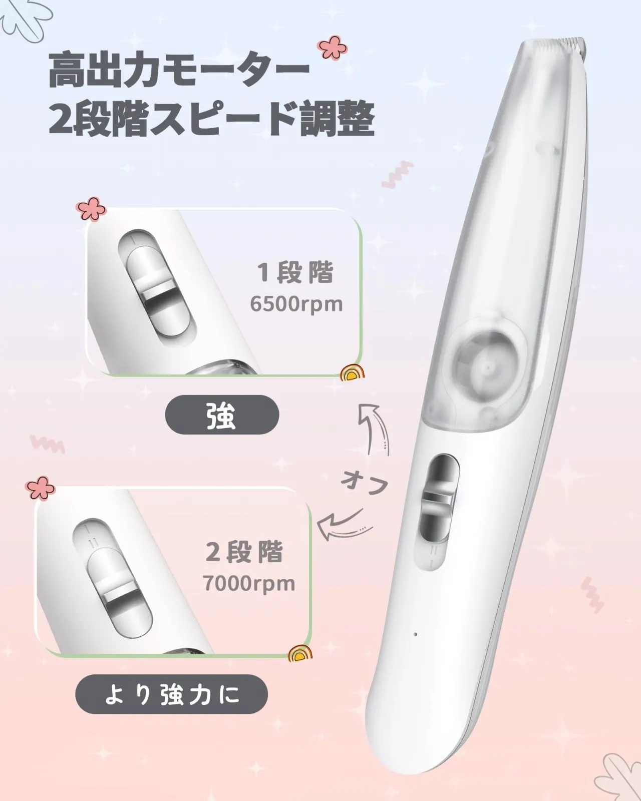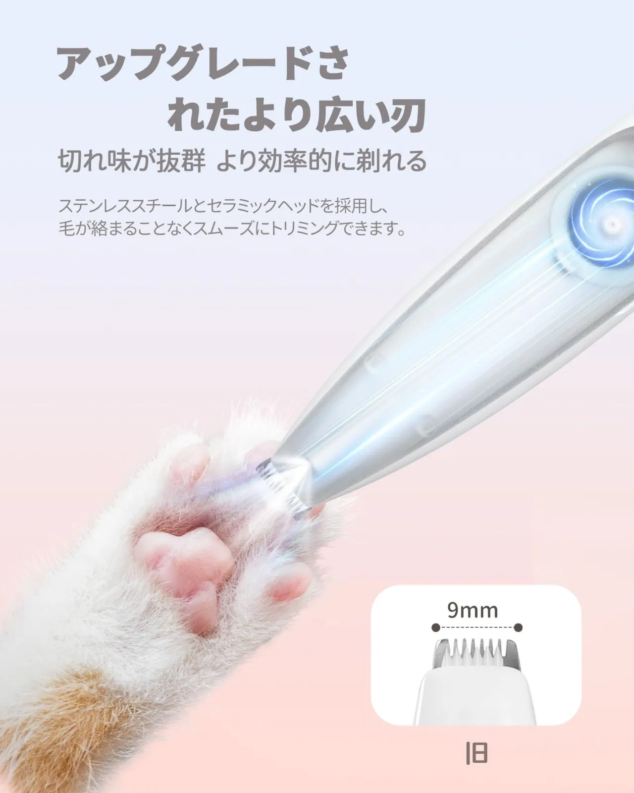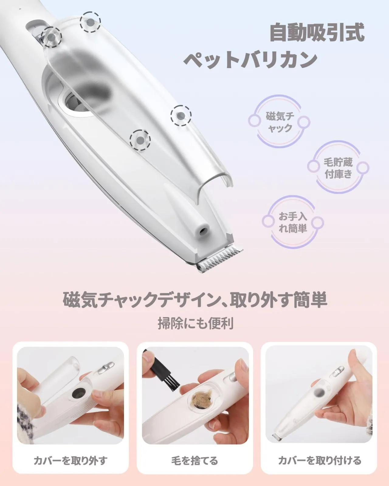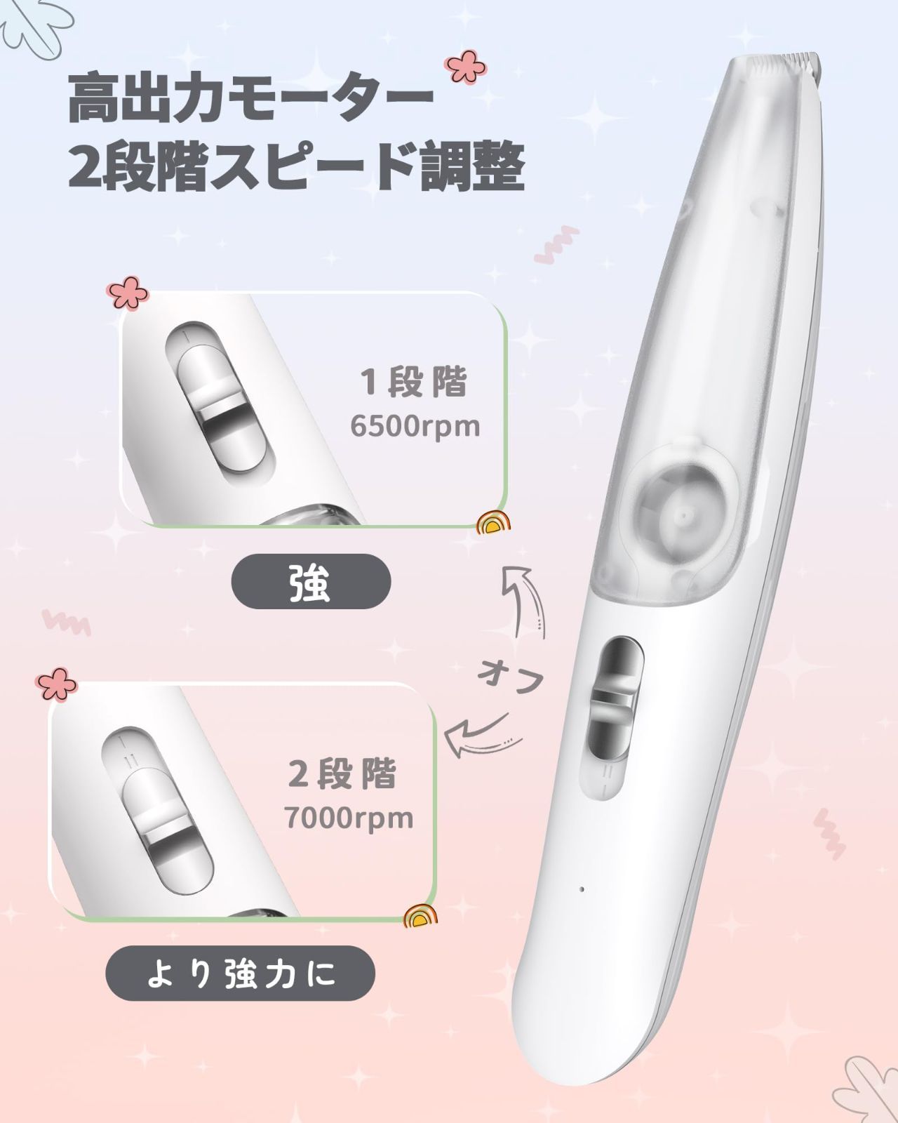 【吸引式】FERRISA 犬用バリカン 犬 猫 足裏用バリカン 静音設計 低振動 LEDライト付き 2段階スピード調整 コードレス 充電式 磁気チャック毛貯蔵庫付き 耳裏 臀部 顔周り お尻周り 小型犬・猫対応 初心者向け ?吸引機能付きペットバリカン 従来の犬用バリカンは、カット後に抜け毛が周囲に散らかり、お掃除が大変でした。FERRISA犬用バリカンは真空吸引機能と磁気チャックを採用し、カットと同時に毛を毛貯蔵庫にしっかり吸引。家の中を清潔に保ち、カットした後の掃除の悩みから抜け出す。 ?静音設計&初心者向け 静音&低振動設計で、ペットが音に敏感でも安心して使用できます。ご自宅で初めての方でも使いやすく、優しく快適にトリミングが可能です。 ?二段階調整可能&疲れにくい設計 本犬バリカンは二段階にスピードが変更できます。ワンタッチで段階調整できます。低回転モードと高回転モードがありますので、狭い部分でのメインでも便利!そして、コンパクトなサイズその上非常に軽い重量(僅か98g)なので長い間それを使用しても、どんな角度でも、手首は疲れを感じません。 ?LEDライト搭載で細部まで見やすい 先端にLEDライトを内蔵。起動と同時に自動点灯し、足裏・耳裏・肉球・お尻周りなど暗くて見えにくい部分のトリミングも安全・正確に行えます。 ?USB充電式&コードレス USB充電式でコードレスだから、場所を選ばずどこでも使えます。約3時間の充電で最大90分連続使用可能。充電しながらの使用にも対応しています。 ?付属品&安心サポート セット内容:猫 バリカン吸引式x1、清掃ブラシx1、USBケーブルx1、ノミの櫛x1。ご購入日から12ヶ月以内、万一ご満足いただけない場合は「カット力が弱い」「使いづらい」など、どんな理由でもお気軽にご連絡ください。24時間以内に誠意をもって対応いたします。 色 青白色 ブランド FERRISA 特徴 吸引式,コードレス,充電式 商品寸法 (長さx幅x高さ) 24 x 8 x 5 cm 対象ユーザー 猫 犬 ペット用 電池が必要ですか? いいえ モデル名 JPFR5086BAI 商品用途・使用方法 犬用バリカン,猫用バリカン 表示を増やす 最後までご確認頂き誠にありがとうございました。 上記をご確認頂き、ご購入いただけましたら幸いです。 何かご不明な点がございましたらお気軽にメッセージからお問い合わせ下さい。