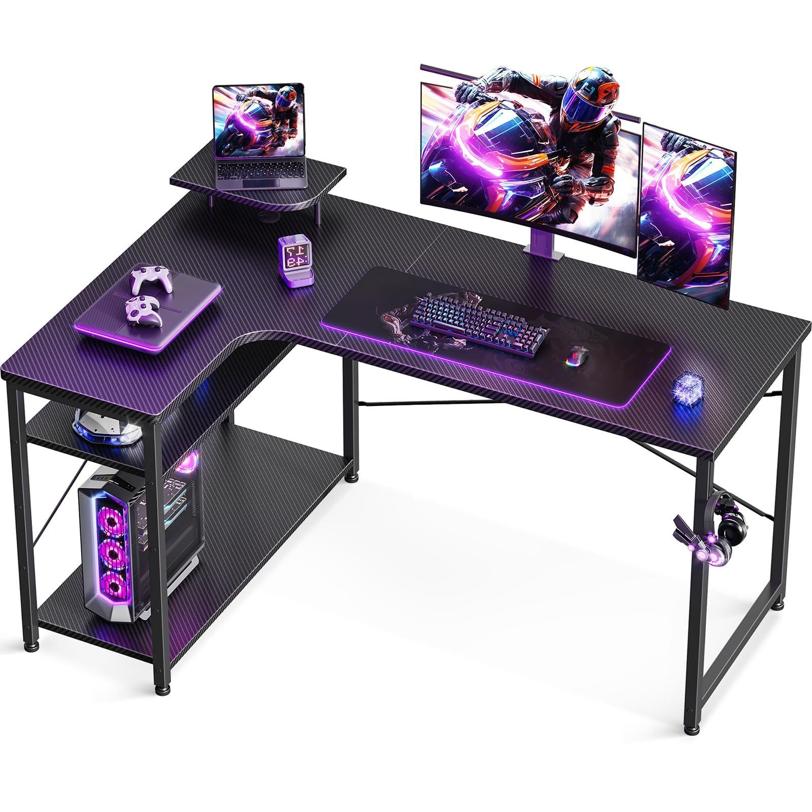 ODK パソコンデスク L字 ゲーミングデスク 幅130 L字デスク 机 desk ラック付き デスク 収納 pcデスク オフィスデスク 在宅勤務 組立簡単 書斎 カーボンブラック 左棚