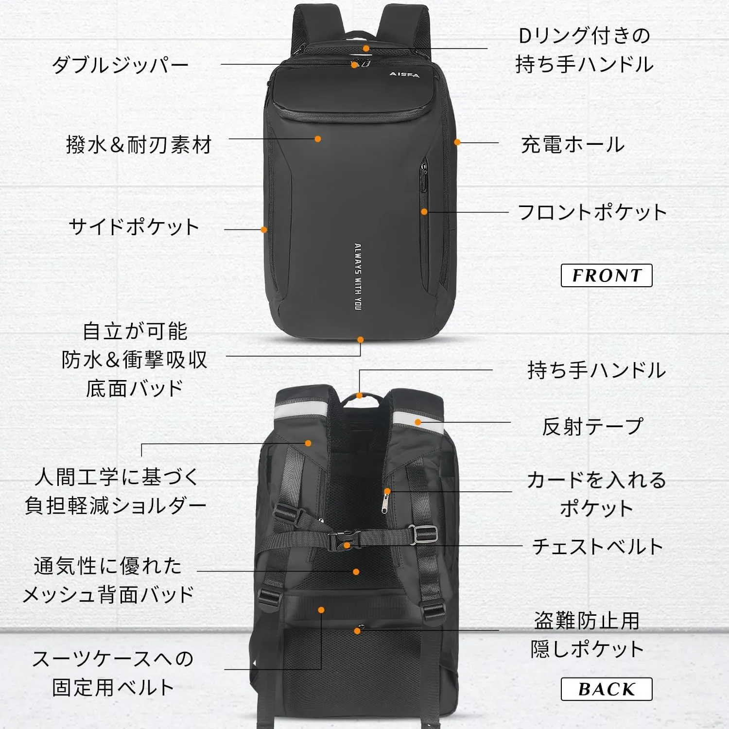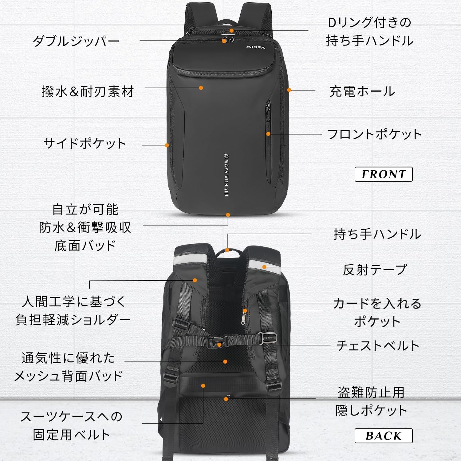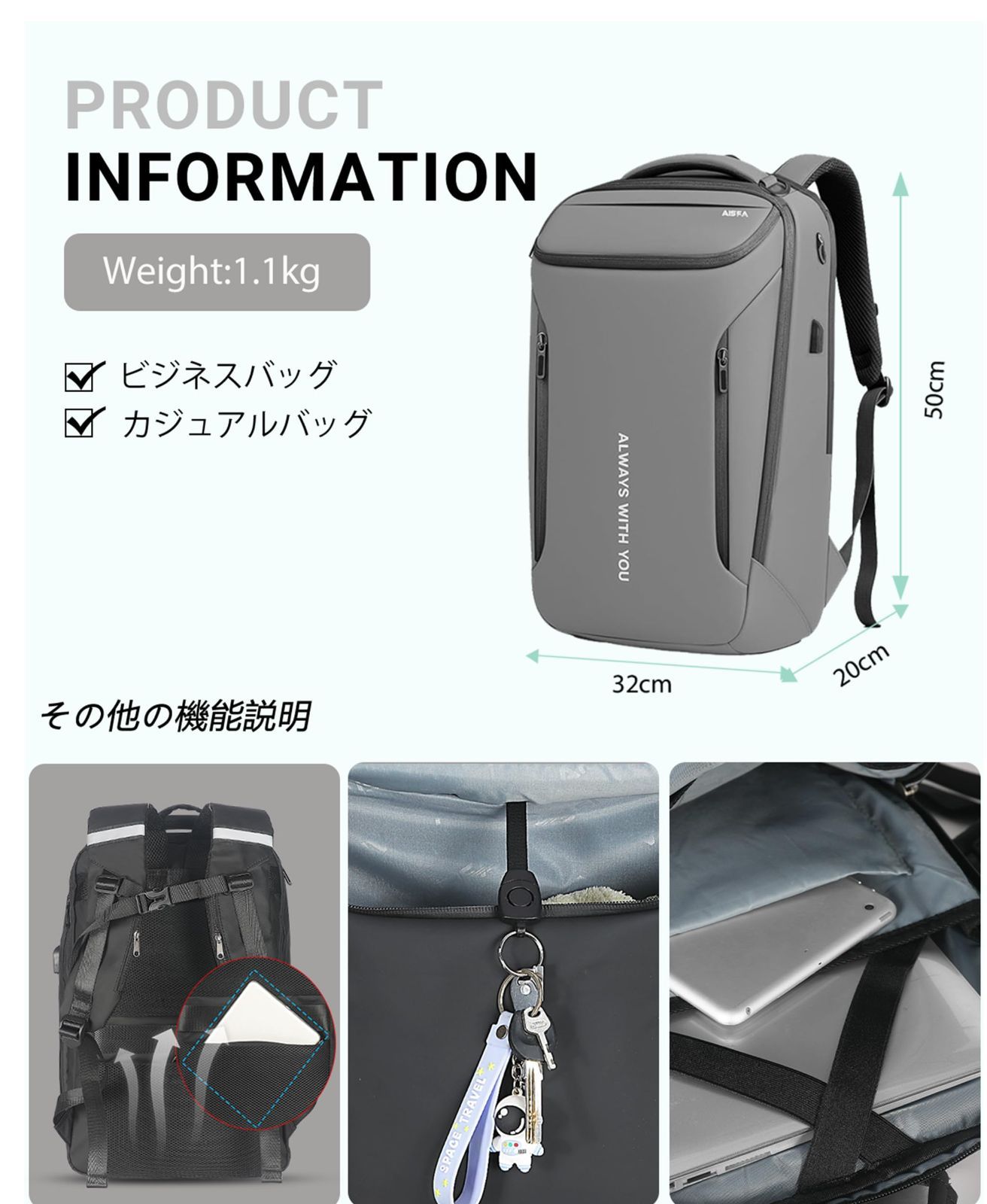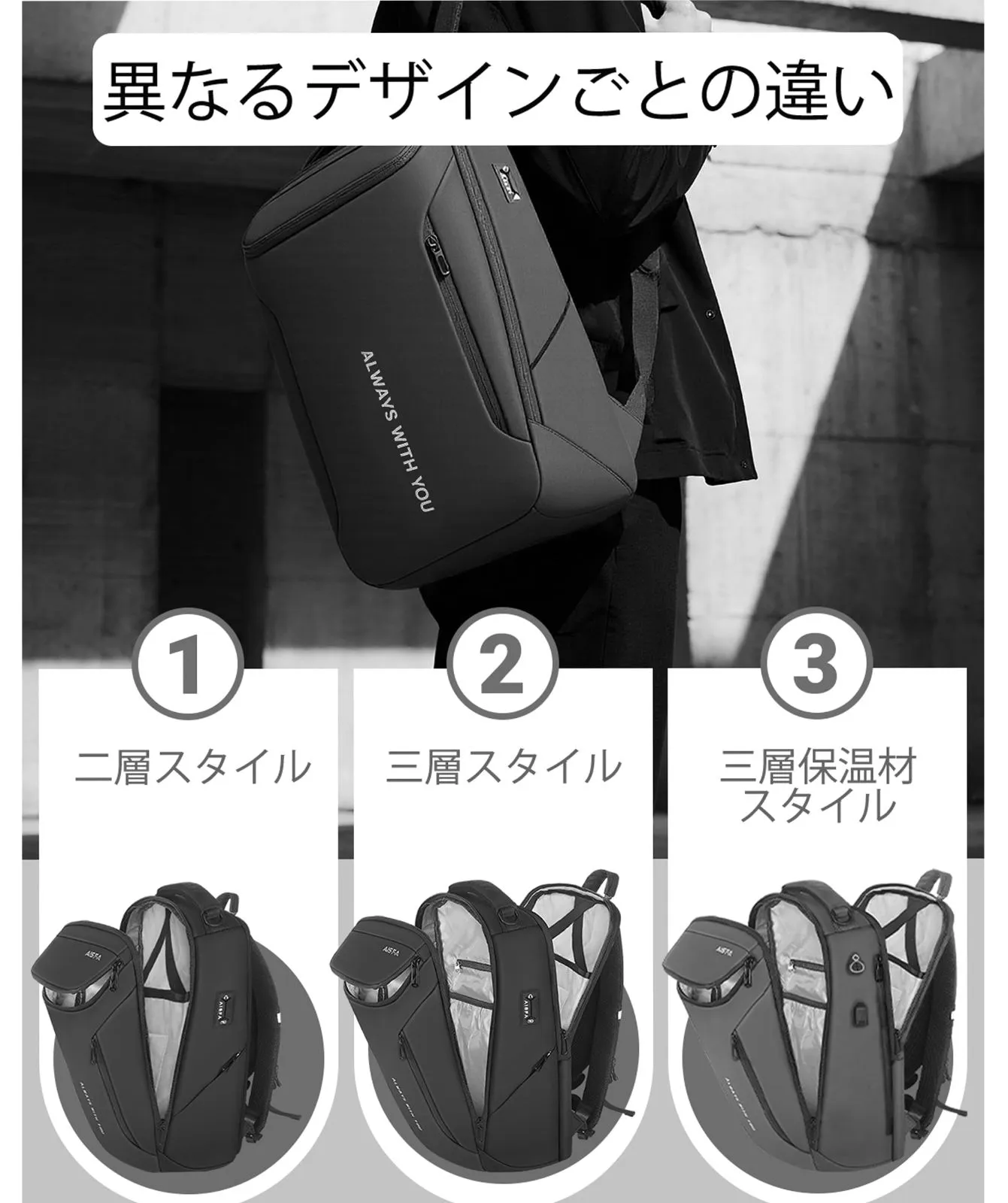 【多機能リュックサック】保温機能:保温ポケットを増設しました。保温だけでなく保冷効果もあります。180°開閉:メインポケットはスーツケースのように約180°大きく開くことができるので、スムーズに出し入れます。反射テープ:反射テープ付きのため、夜間・暗がり・雨天時に車や歩行者からの視認性を大幅に向上させます。キーホルダー:フロントポッケトには着脱式キーホルダー付き、鍵を探す手間が省けます。USB充電可能:側面にはUSBケーブルとイヤホン穴があり、背負ったまま充電可能です。 最後までご確認頂き誠にありがとうございました。 上記をご確認頂き、ご購入いただけましたら幸いです。 何かご不明な点がございましたらお気軽にメッセージからお問い合わせ下さい。