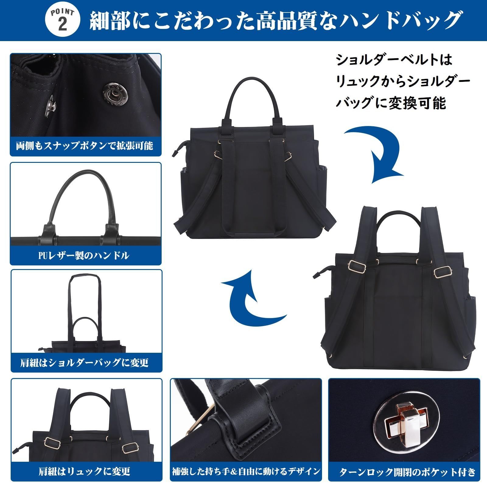 【アップグレードしたデザイン】①オーバーレイのタイプです。外側にターンロックが付いており、アイテムの落下や紛失などを効果的に防止できます。②両側はスナップボタンで拡張可能で、ボタンを閉じるときは丸型で、可愛くなります!③ハンドルの下部のステッチは補強されており、より丈夫で安定しています。それに、待ち手の下部は穴を通じて自由に動かせるので、背負う場合、待ち手は邪魔になりません。④ショルダーベルトの長さを調節可能、女の子とピッタリなサイズです。それに、肩紐を使えば、すぐリュック・ショルダーバッグに変更可能。⑤バックパックのメイン気室内部には、ストラップのキーホルダーを備えており、複数の鍵をまとめることで、携帯しやすくなり、紛失しにくくなります。⑥両側はスナップボタンで拡張可能で、ボタンを閉じるときは丸型で、可愛くなります! 最後までご確認頂き誠にありがとうございました。 上記をご確認頂き、ご購入いただけましたら幸いです。 何かご不明な点がございましたらお気軽にメッセージからお問い合わせ下さい。