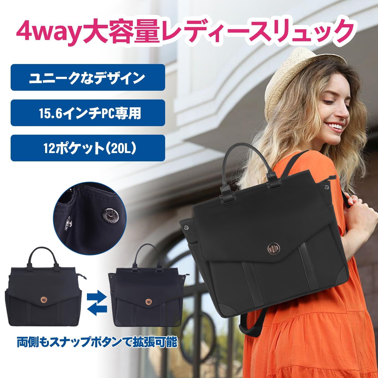 オーバーレイ リュック レディース 16インチ 15.6インチPC収納 大容量 4way ハンドバッグ バックパック 斜め掛け ショルダーバッグ 防水 出張 旅行 通学 通勤 拡張可能 12ポケット 20L ターンロック キーホルダー付き