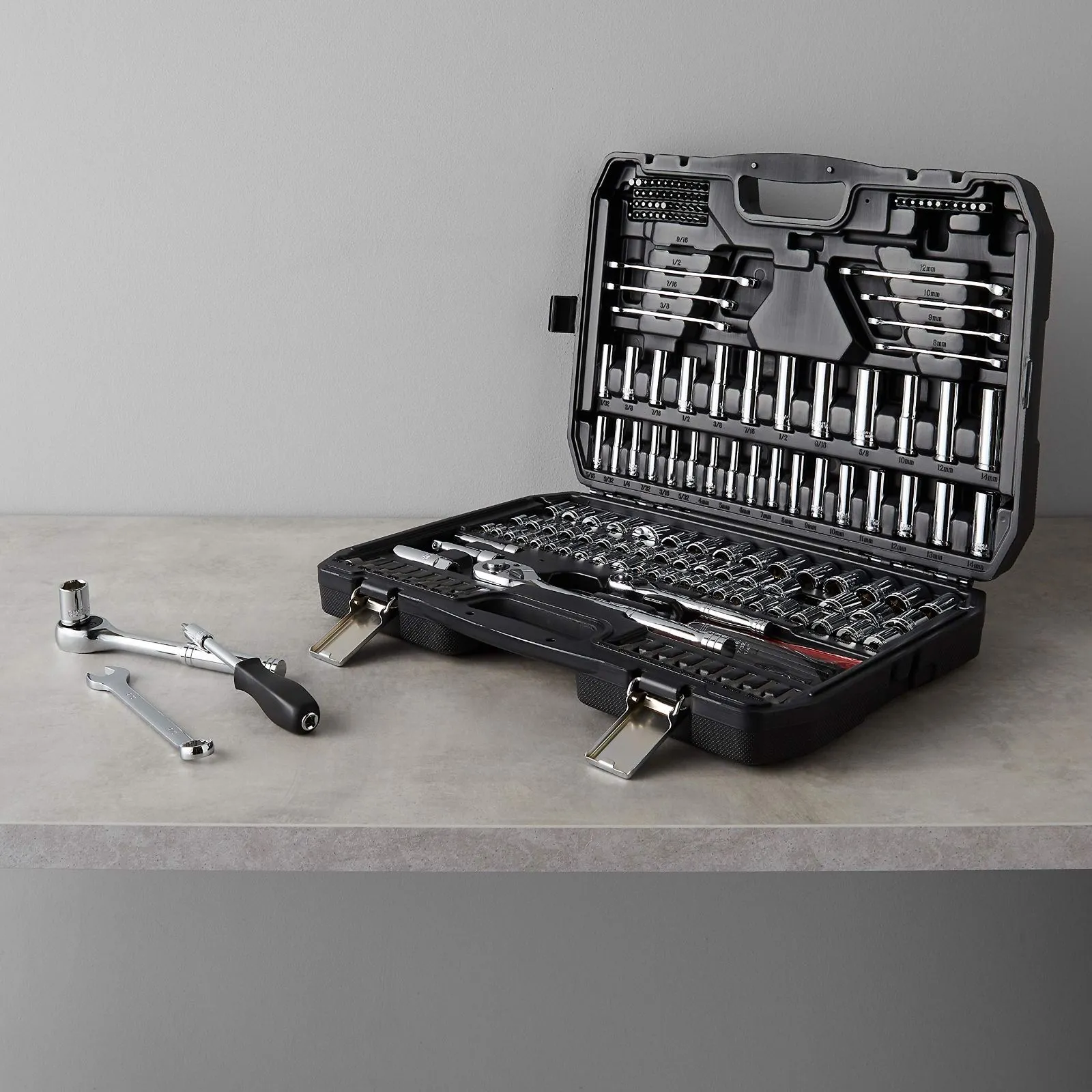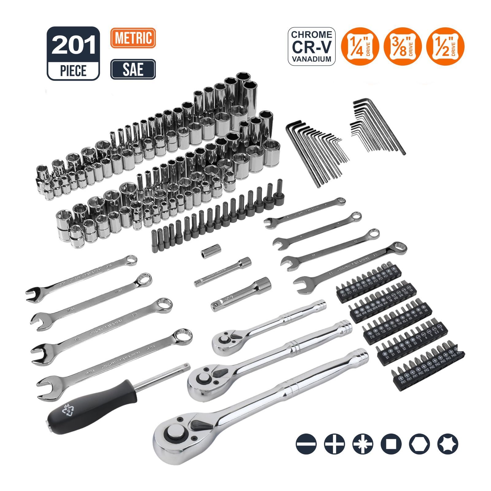 セット内容 : 201個 (一般的なソケット、レンチ、六角スパナ、一般的なドライバービット等)