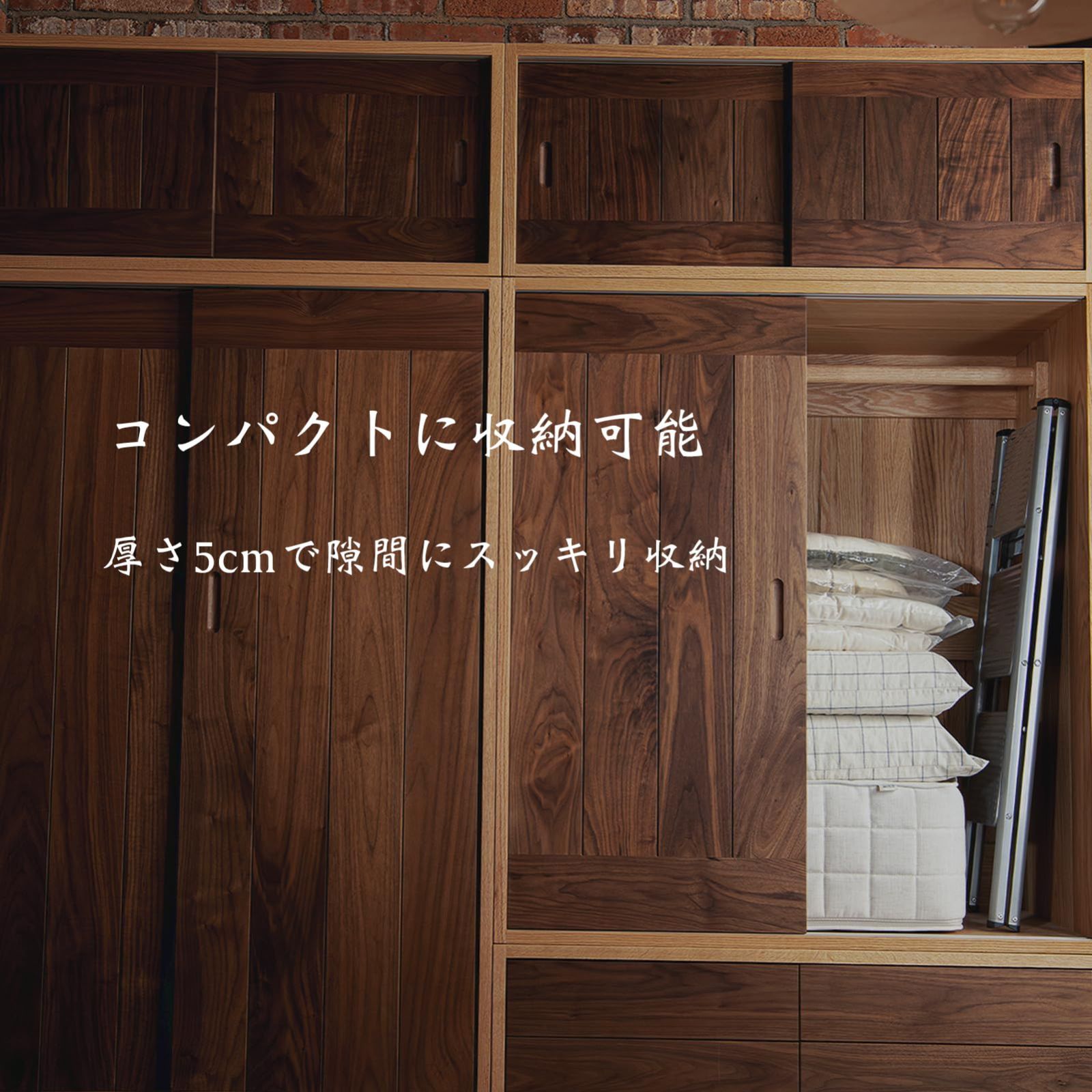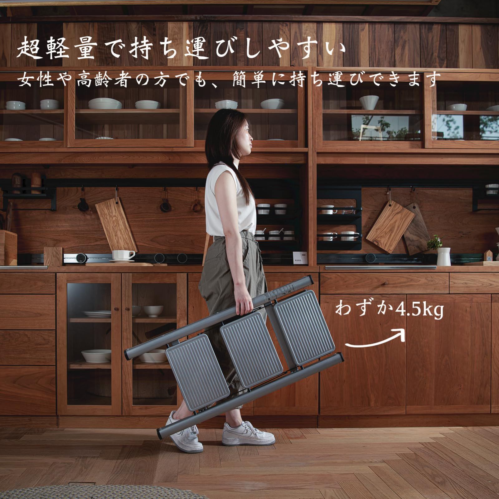 【超軽量・省スペース】女性や高齢者の方でも片手でラクラク持ち運びができる超軽量設計で、重量は約4.5kgです。さらに、使用しないときはサッと折りたたんで幅わずか5cmのスリムなサイズになり、隙間に収納できるため、スペースを有効活用できます。