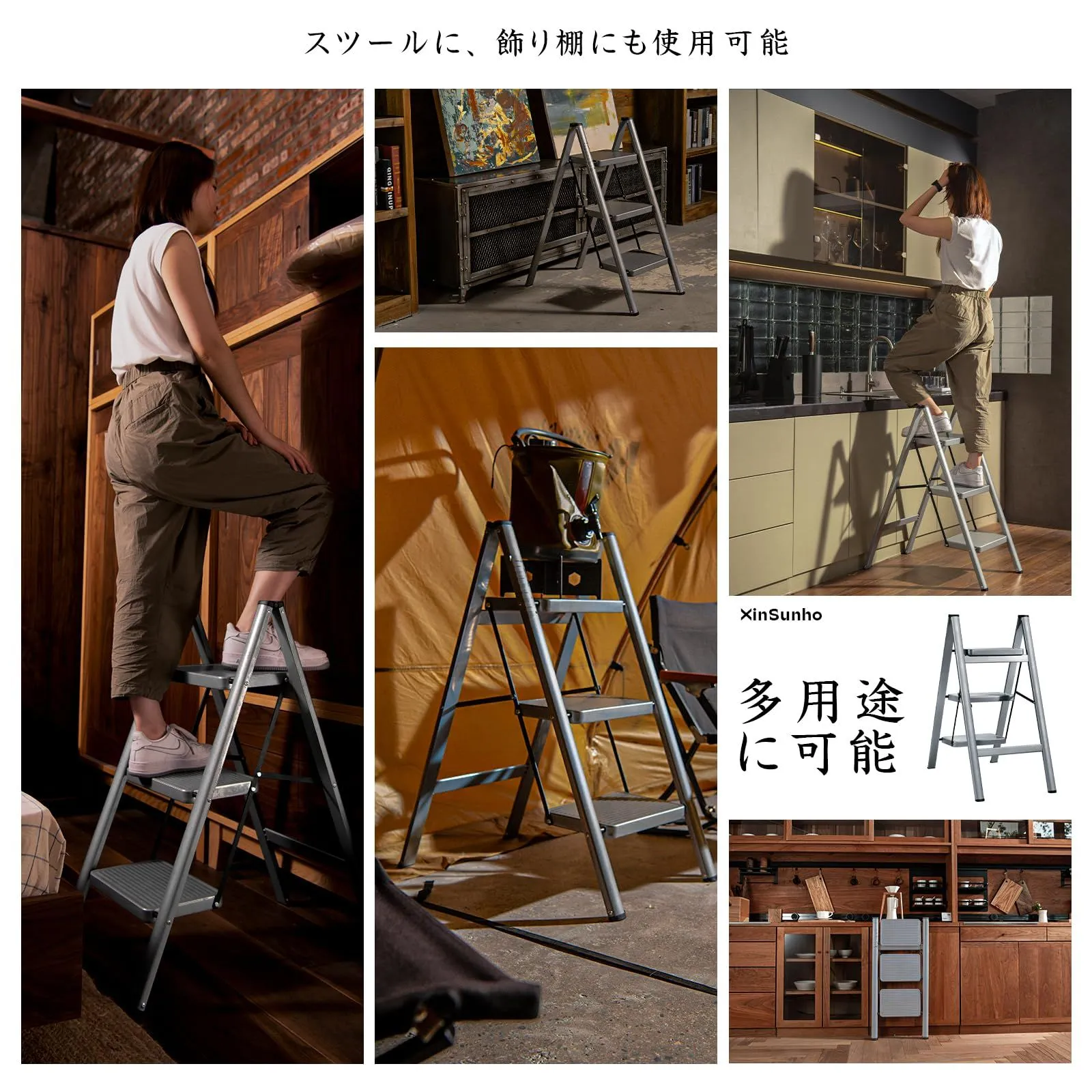 【多用途に可能】脚立としての本来の機能を備えながら、ディスプレイラックやスツールとしても活用できるステップラダーです。エアコン掃除、車の洗車、電球を交換、高い所の窓拭き、食器棚の上棚の収納、倉庫・店舗内作業など、さまざまな用途に対応します。あらゆるシーンで活躍する、便利な折りたたみ脚立です。