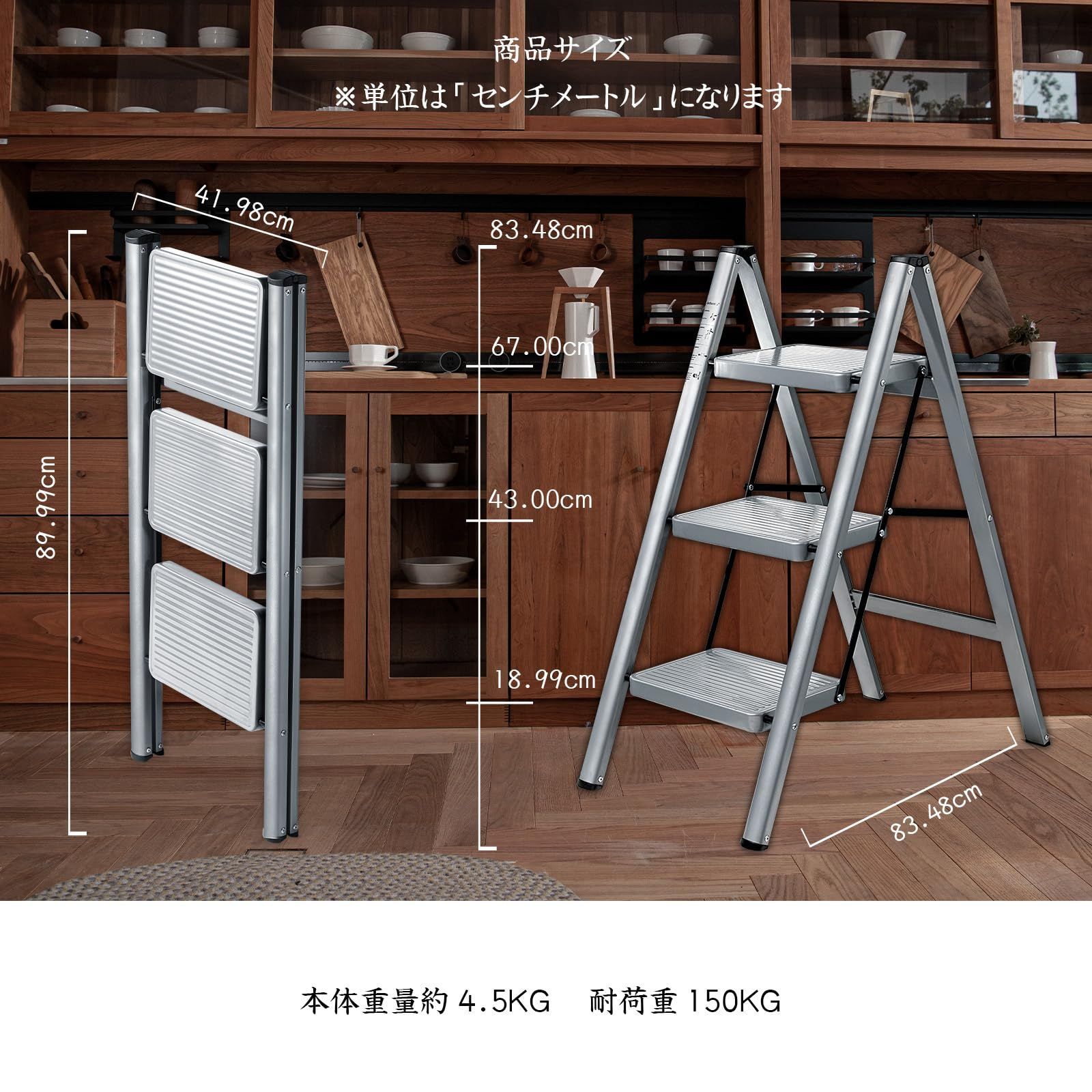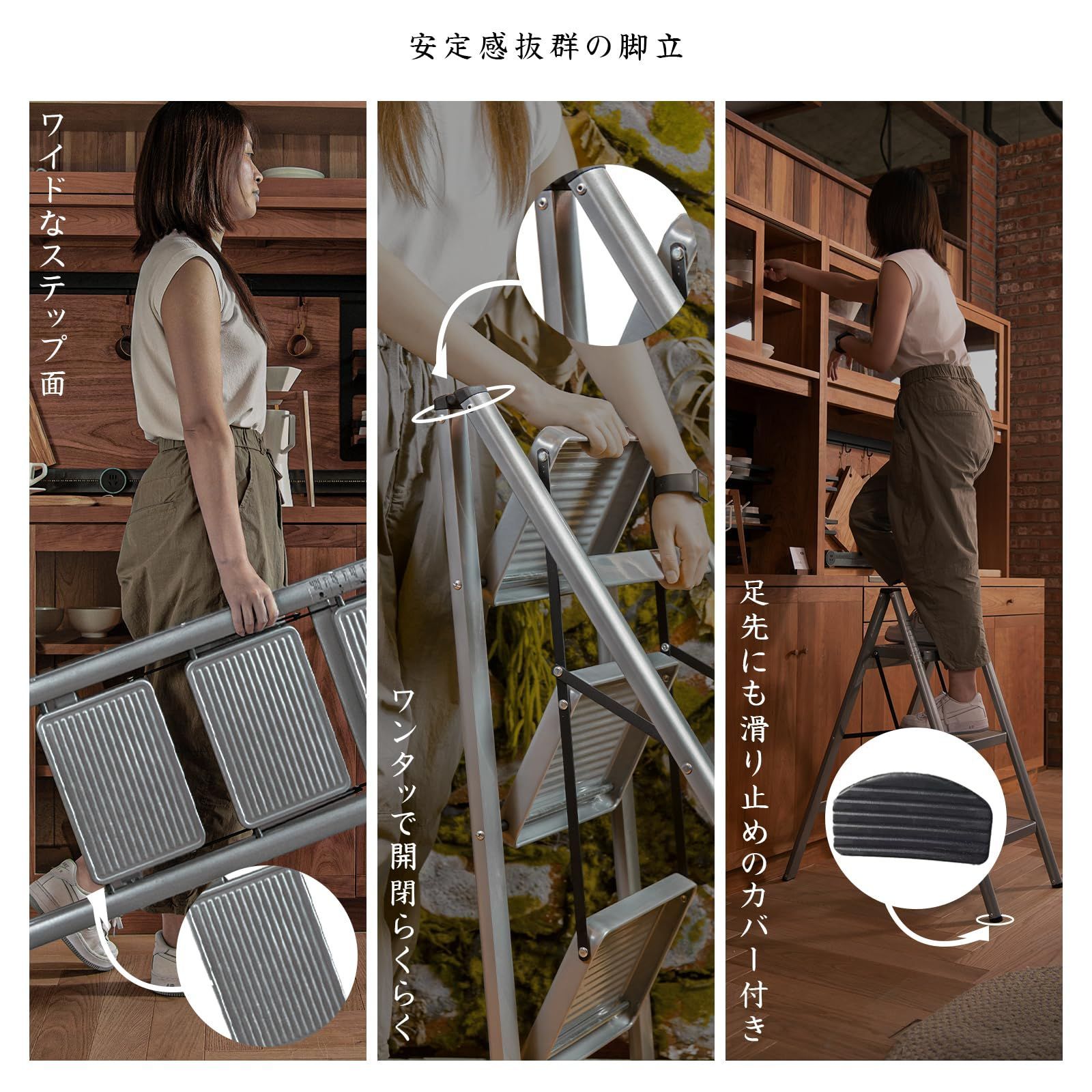 【安定感抜群の脚立】耐荷重150kgの丈夫なスチールフレーム製の3段脚立は、安定感抜群です。ステップ面は凹凸の滑り止め加工を施し、足先にも滑り止めが付いているので、使用中に床への傷を防ぎます。しっかりとした作りとデザインのシンプルさが特徴で、安全性にも配慮しています。