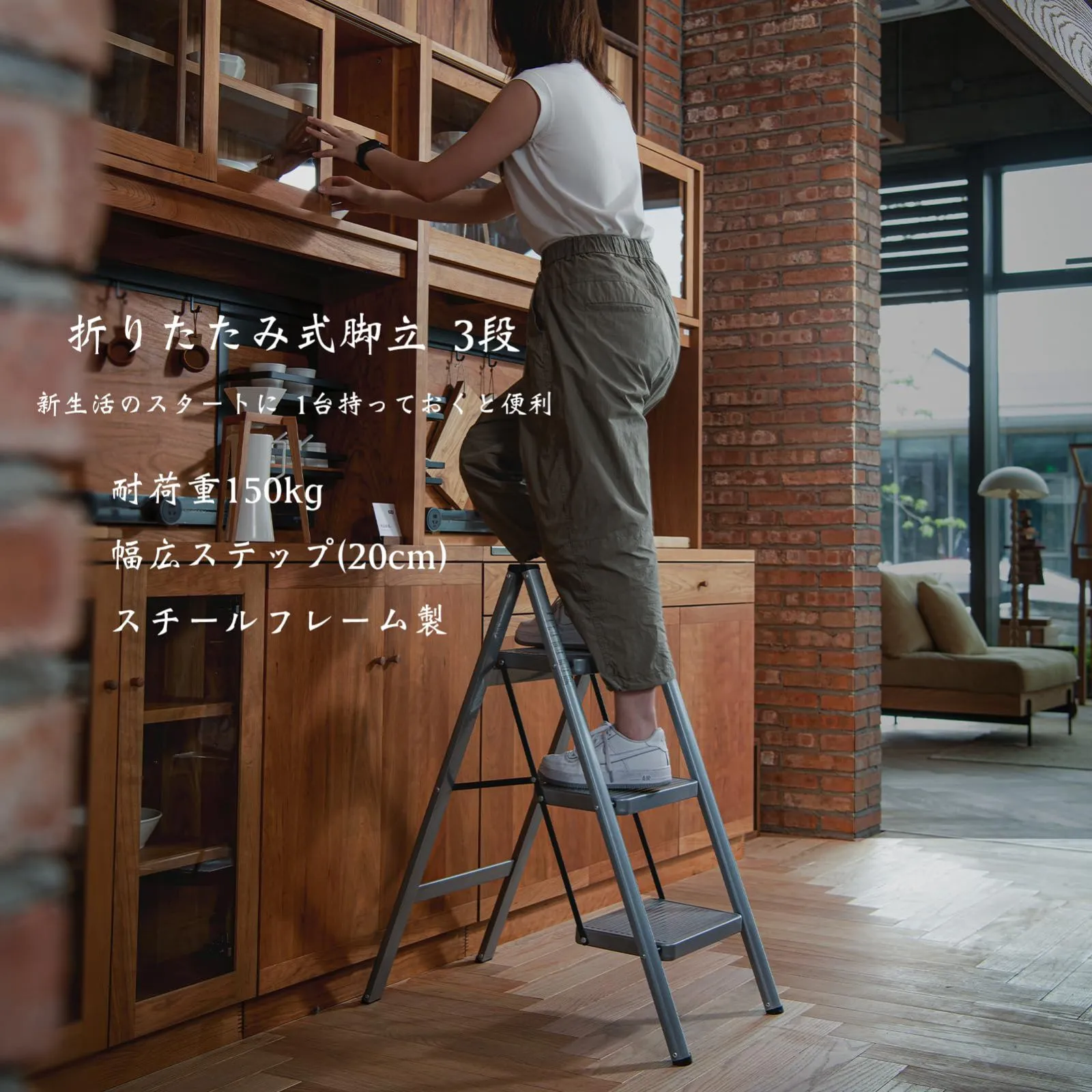 【折りたたみ式脚立 3段】この脚立は、サッとたたんでコンパクトになる折りたたみ式で、手軽に持ち運べる優れたアイテムです。パールグレーのカラーがおしゃれなデザインと時尚感を演出し、新生活に欠かせない家具の一つとして特におすすめです。