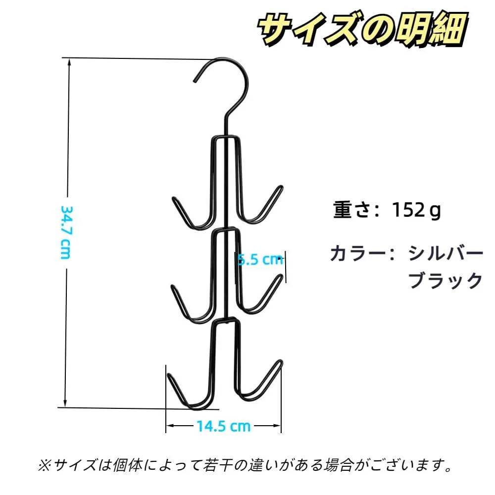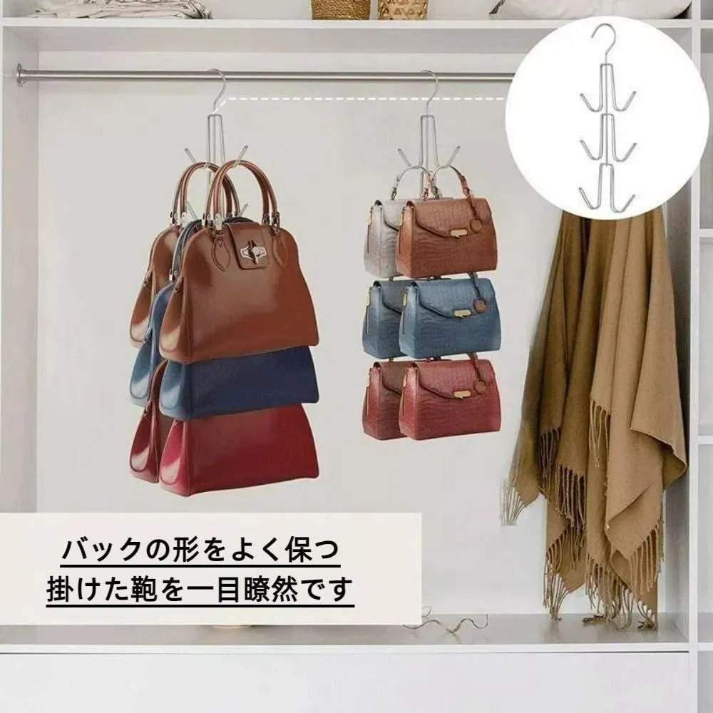 【幅広い用途】このバッグ収納ハンガーは幅広い用途に対応しており、バッグだけでなく、ネクタイ、帽子、靴、ヘッドホン、スカーフ、マフラー、ベルト、いろいろな小物など、長さのあるアイテムをすっきりと収納できます。クローゼットの整理はもちろん、玄関やオフィス、子供部屋など、さまざまな場所で活用でき、非常に使い勝手が良いです。 高さ35cm×幅13.5cmの金属製ラック(2個組)です。耐久性に優れ、各ラックに装備された6本(合計12本)のV字型フックは、バッグを傷つけず安定して収納。360°回転式で取り出しが容易です。バッグはもちろん、帽子やベルトなど様々な長尺アイテムの整理に幅広く活用でき、クローゼットや玄関などあらゆる空間をスッキリと効率化します。 最後までご確認頂き誠にありがとうございました。 上記をご確認頂き、ご購入いただけましたら幸いです。 何かご不明な点がございましたらお気軽にメッセージからお問い合わせ下さい。