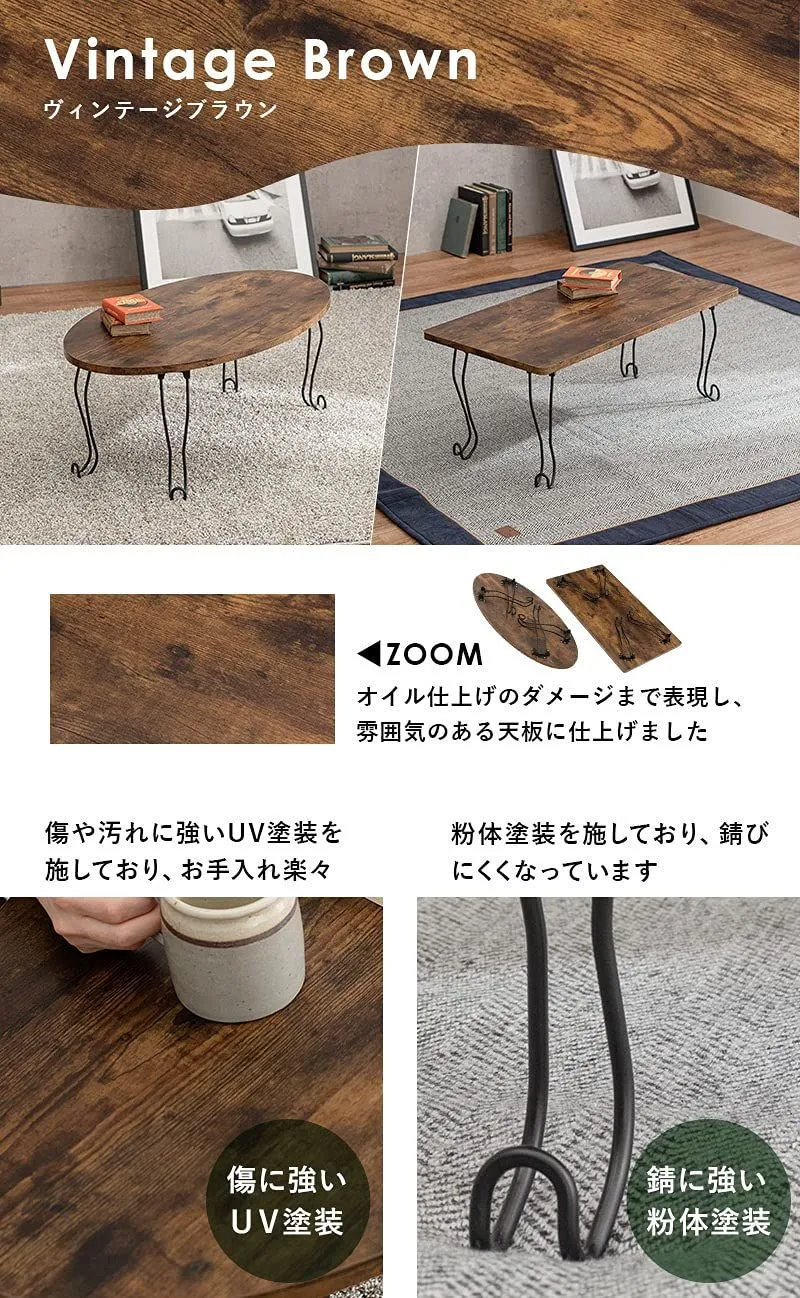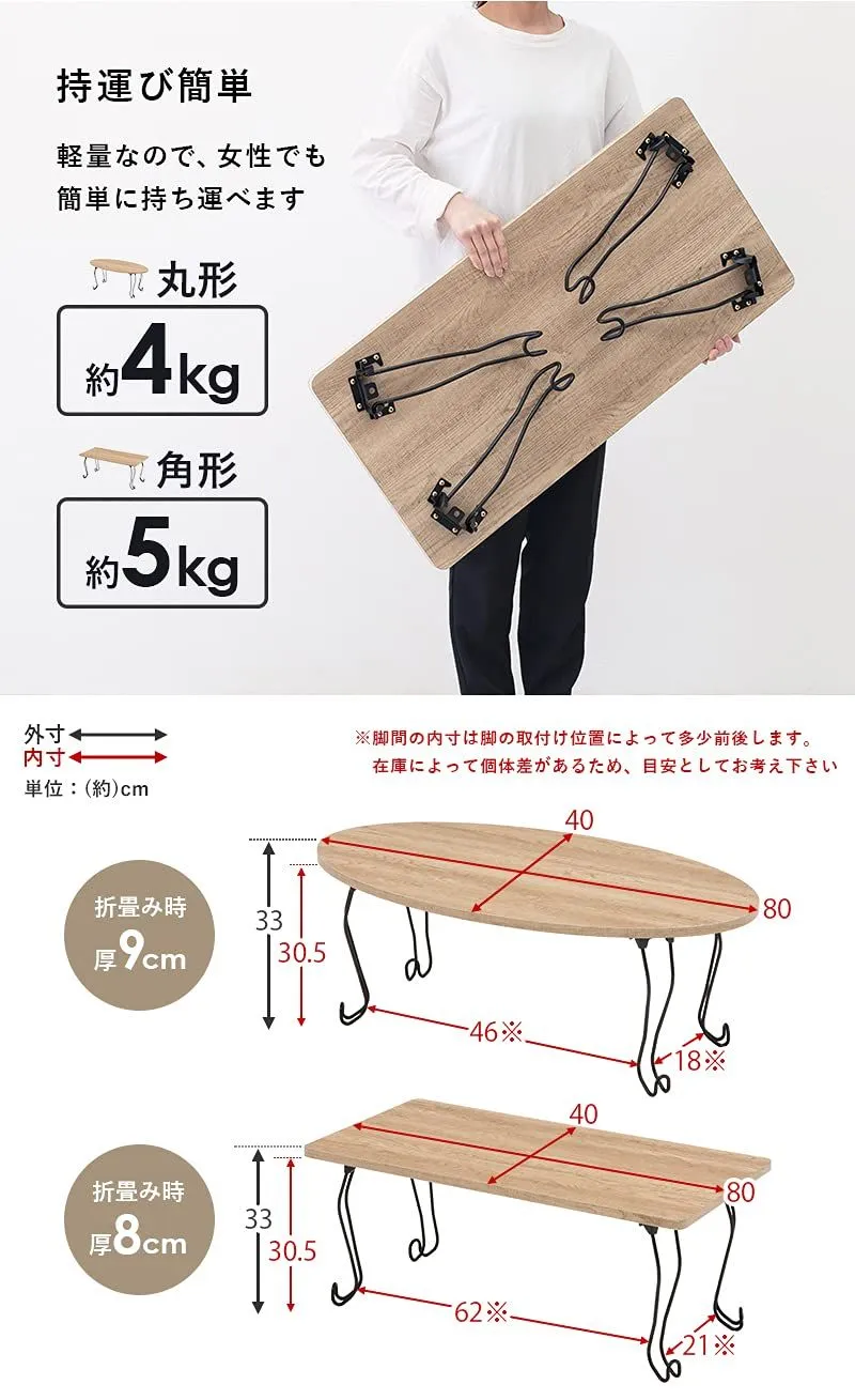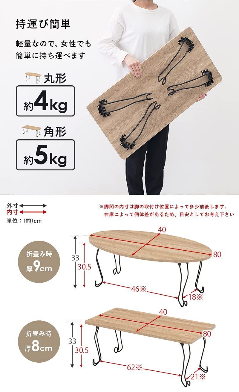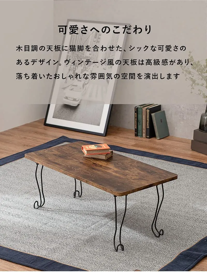 【折りたたみ式&軽量タイプ】:重量は約4kgと女性でも運びやすい仕様。模様替えやお掃除の際も簡単に移動していただけます。 古木調の天板に猫脚を合わせた、シックな可愛さのある折りたたみテーブル。〈br〉コンパクトなので一人暮らしなどのワンルームや狭いお部屋、子供部屋などにおすすめ。〈br〉折りたたむとソファ下やちょっとした隙間に収納できるので、来客時のサブテーブルやリモートワーク、リモート授業専用のテーブルとしても活躍します。 安全警告 このテーブルは折りたたみ式です。使用時は慎重に扱ってください。また、この製品は子供向けではありません。小さな部品があり、子供が口に入れる可能性があります。 最後までご確認頂き誠にありがとうございました。 上記をご確認頂き、ご購入いただけましたら幸いです。 何かご不明な点がございましたらお気軽にメッセージからお問い合わせ下さい。