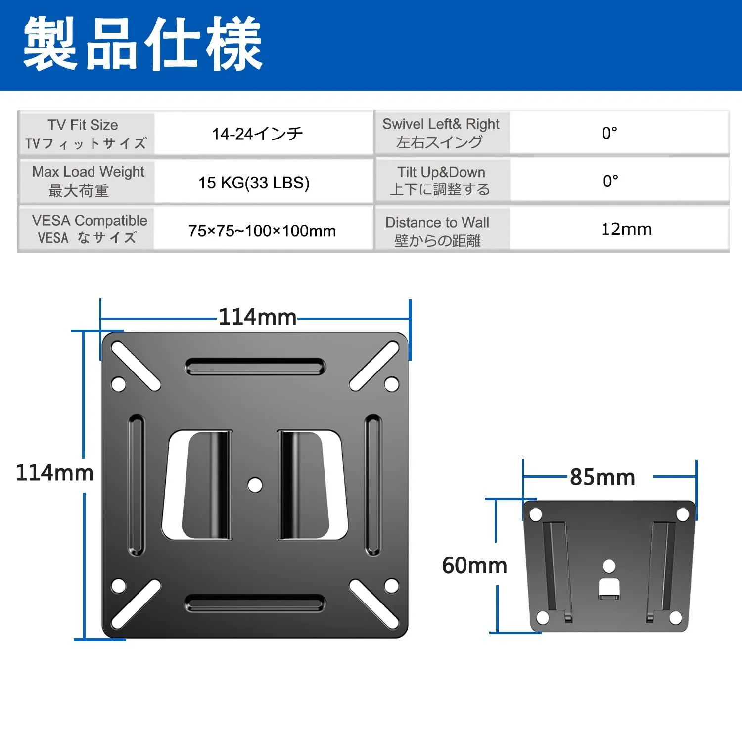 【固定式液晶モニター 壁掛け金具】14~24型程度までの設置が可能で、耐荷重は15kgです。テレビ用ブラケットはVESA 75X75mm、100X100mmに対応しています(縦:75~100mm 横:75~100mm)。14~24インチLCD・LED・液晶テレビに対応の汎用タイプです。LG、Samsung、Hisense(ハイセンス)、Toshiba Regza(東芝レグザ)、Panasonic Viera(パナソニックビエラ)、Sharp Aquos(シャープアクオス)、TCL様々なTV にも広く対応 壁掛け。