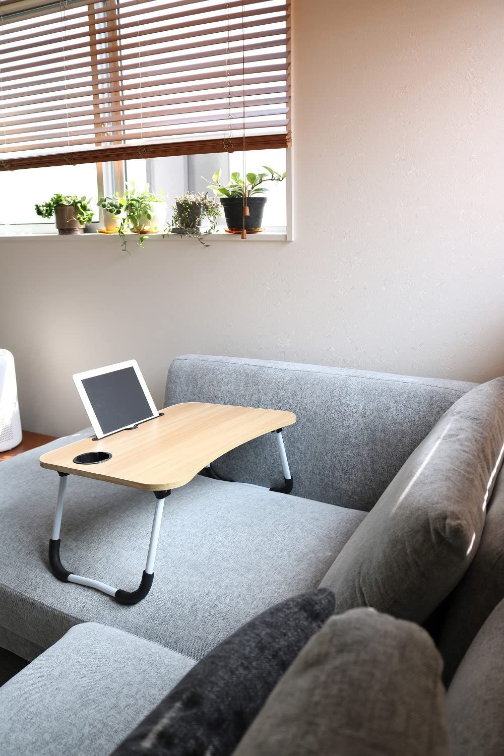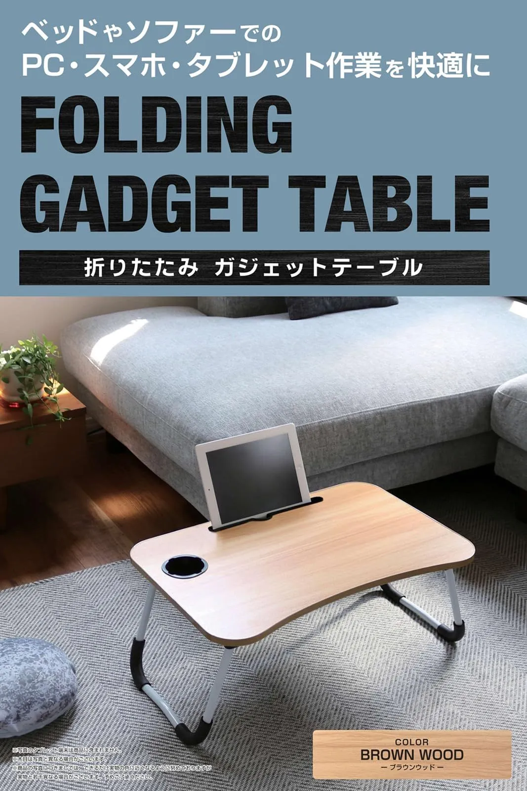 トレードワン(TRADE ONE) 折りたたみガジェットテーブル ノーマルサイズ ソファでお仕事 耐荷重10kg コンパクト 幅60×奥行40×高さ26.5cm タブレットスタンド付き ドリンクホルダー付き 持ち運び便利 ブラウン 60122