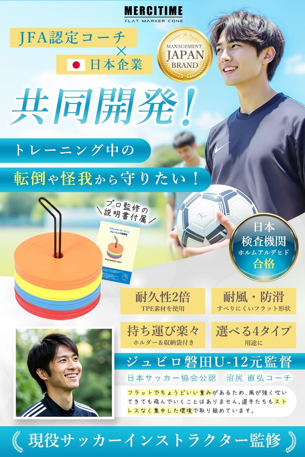 【つまずきにくいフラット形状を採用】従来のコーン型のマーカーと異なり、フラットな形状を採用することで、つまずきや転倒のリスクを大幅に軽減しました。お子様やシニアの方でも安心してトレーニングに取り組めます。また、ボールが当たってもイレギュラーバウンドしにくいため、集中して練習に取り組めます。