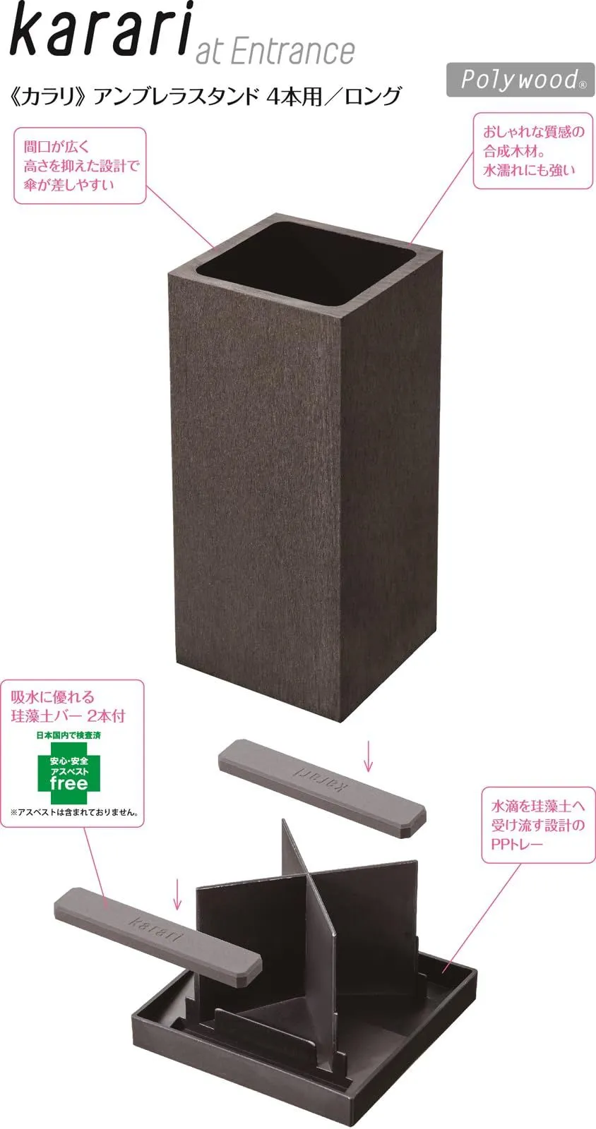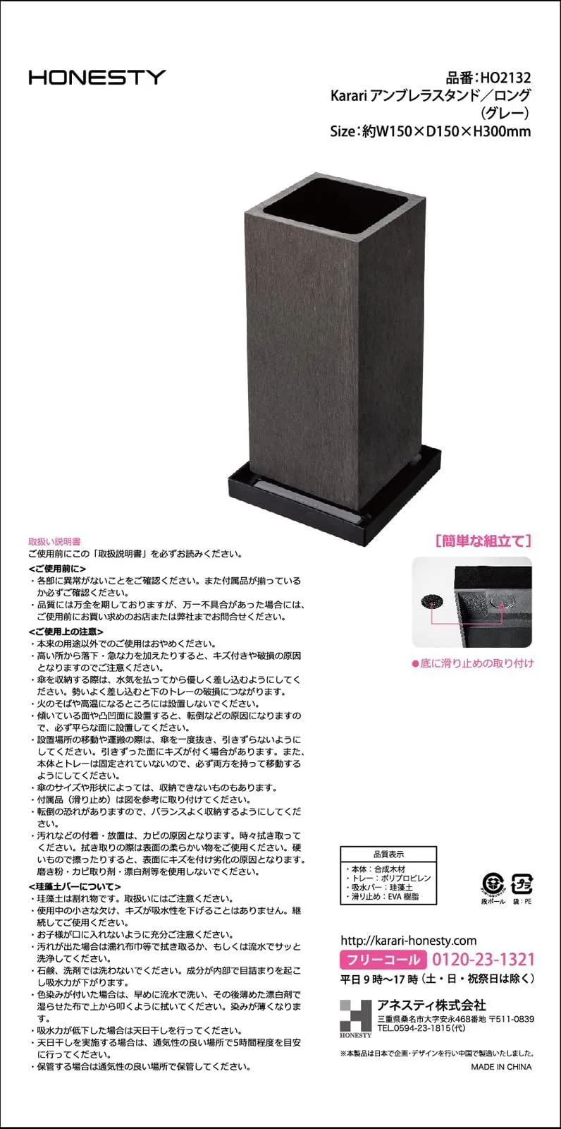 アネスティカンパニー アネスティ(Honesty) 傘立て グレー 幅15×奥行15×高さ30cm karari 珪藻土 アンブレラスタンド ロング 4~8本用 吸水 玄関 省スペース 収納 HO2132