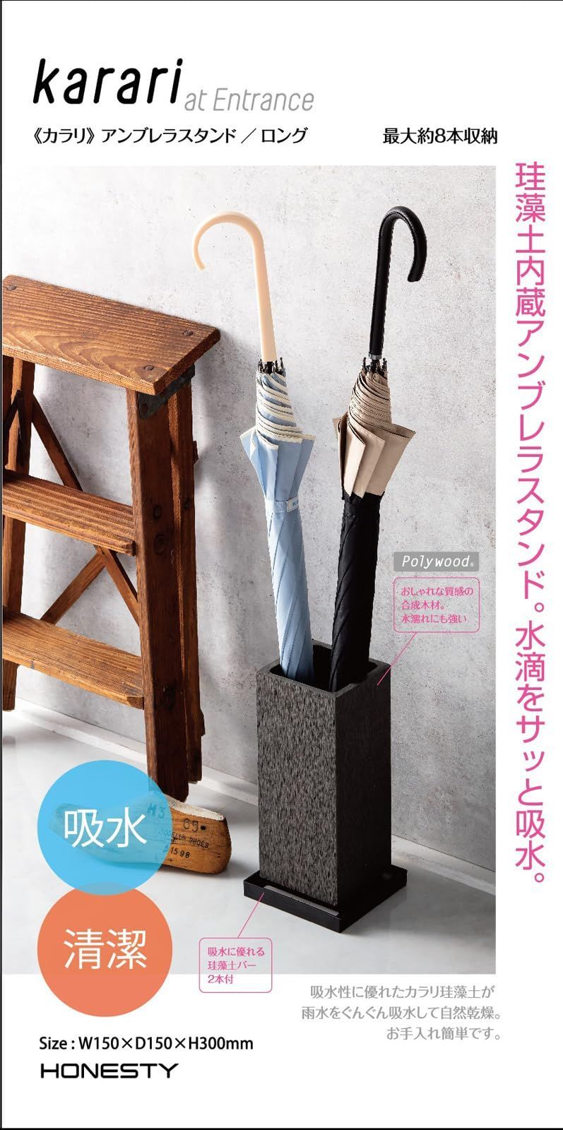【新着商品】グレー 幅15×奥行15×高さ30cm karari 珪藻土 傘立て アンブレラスタンド ロング 4~8本用 アネスティ(Honesty) 吸水 玄関 省スペース アネスティカンパニー 収納 HO2132