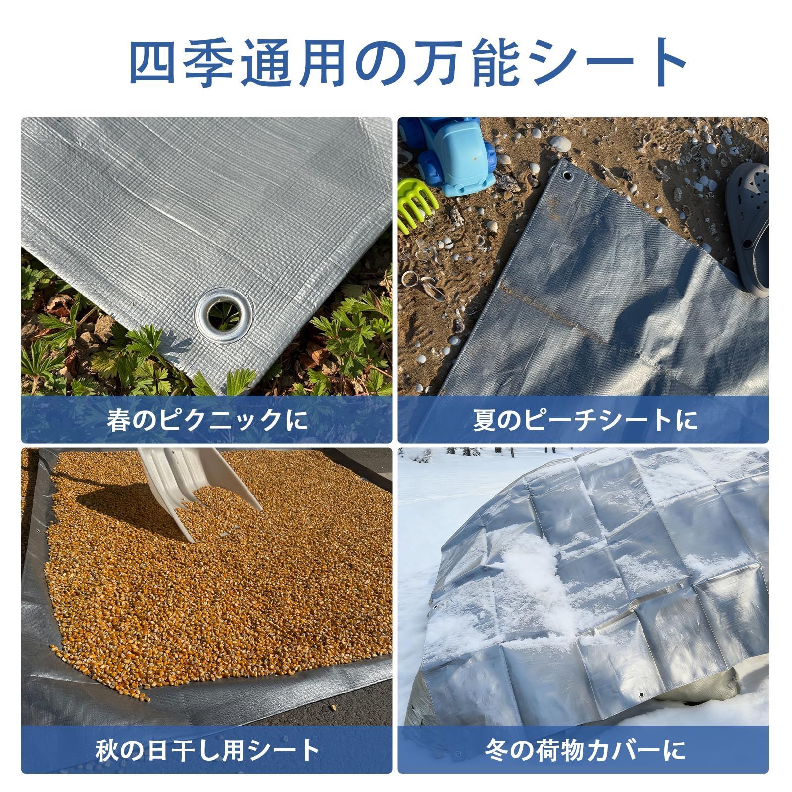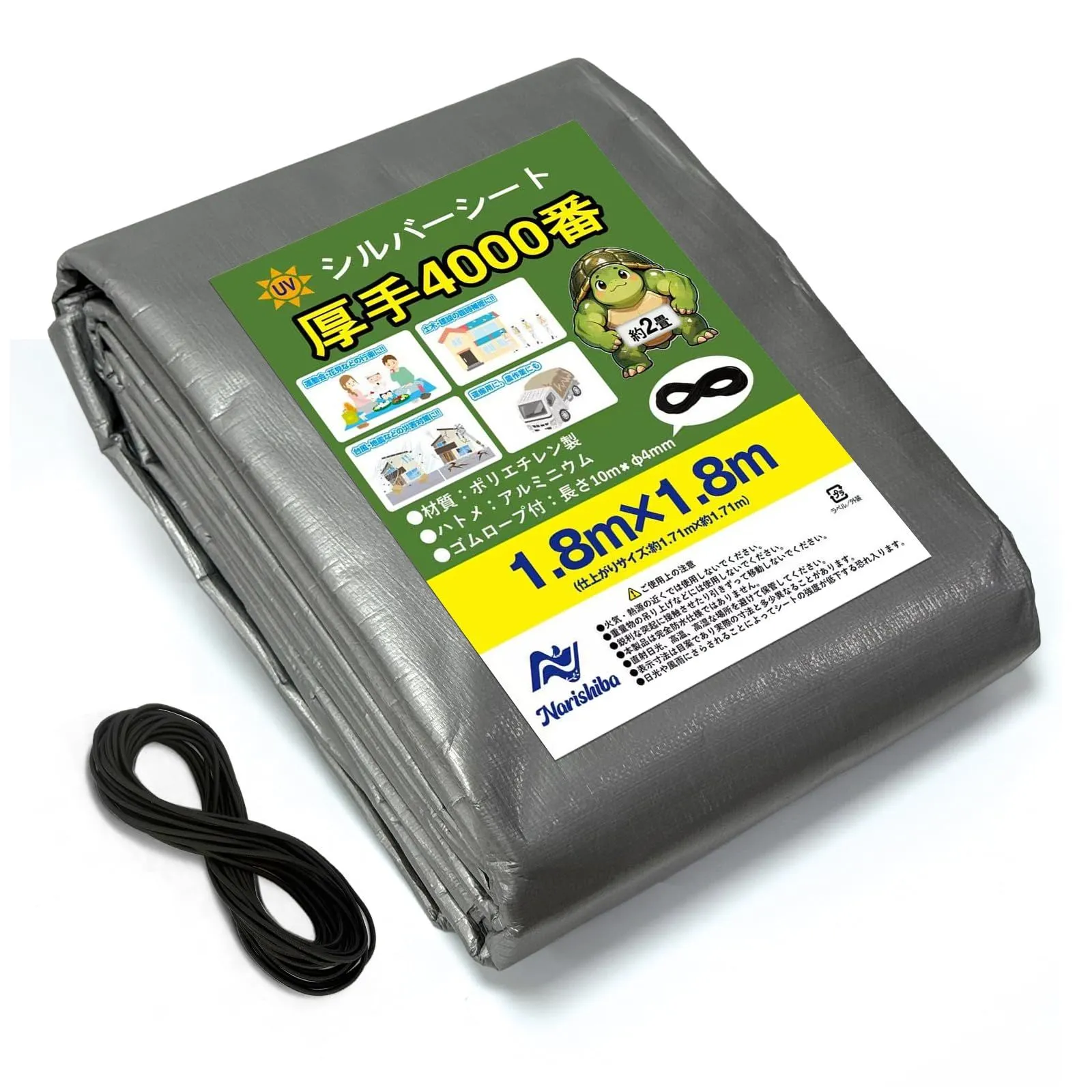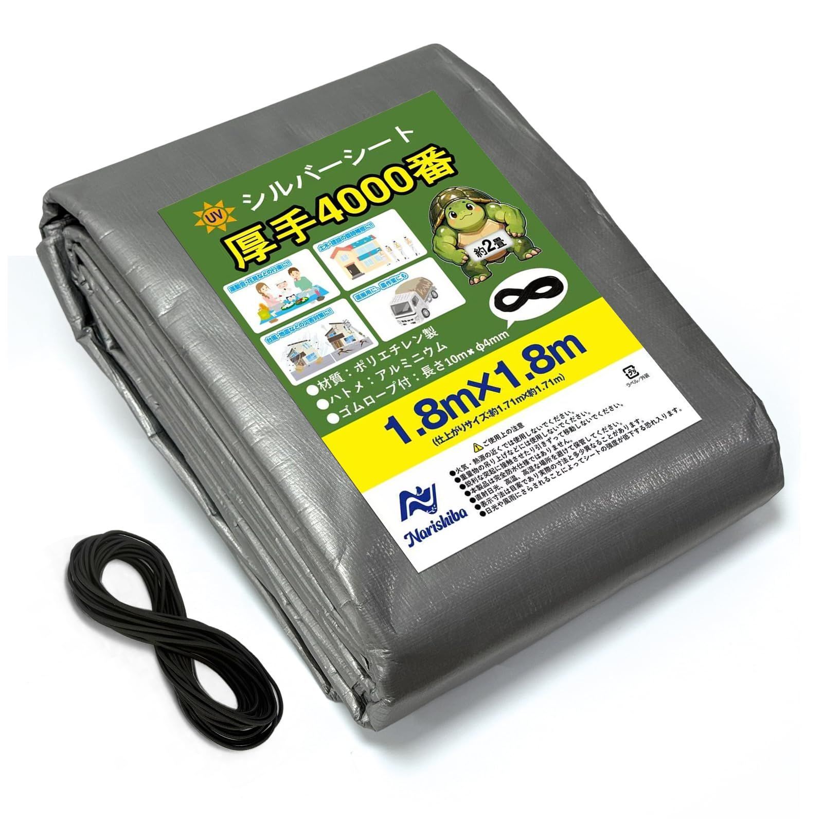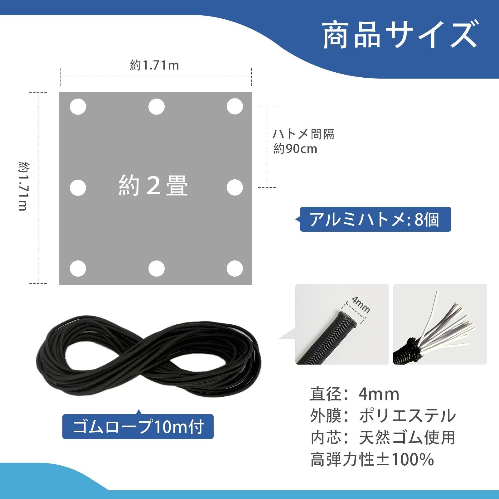 商品仕様:シート材質:ポリエチレン (PE) ハトメ材質:アルミ(8個) シートサイズ:1.8m×1.8m (実寸:約1.71m×1.71m)(約2畳)色:シルバーシート商品の厚さ:約0.4mm、ゴムロープ付き(10M)直径:4mm