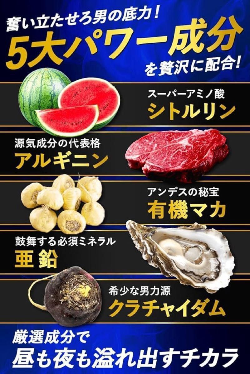 【2大成分を贅沢配合】男性に人気の有機マカとLーシトルリンをこれでもかと贅沢に配合しました。「ここぞというときの勝負」や「もう一段階ギアを上げたい」そんなときに男性をサポートしてくれます。