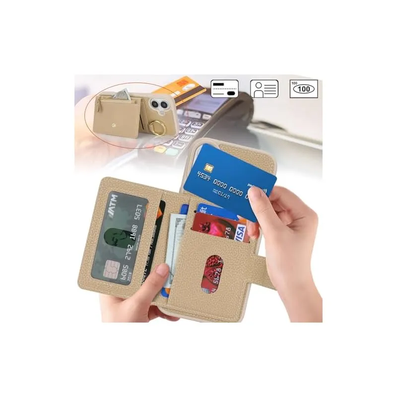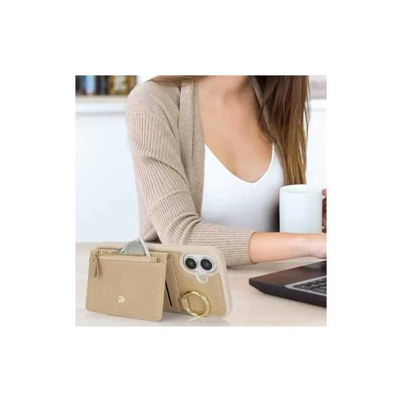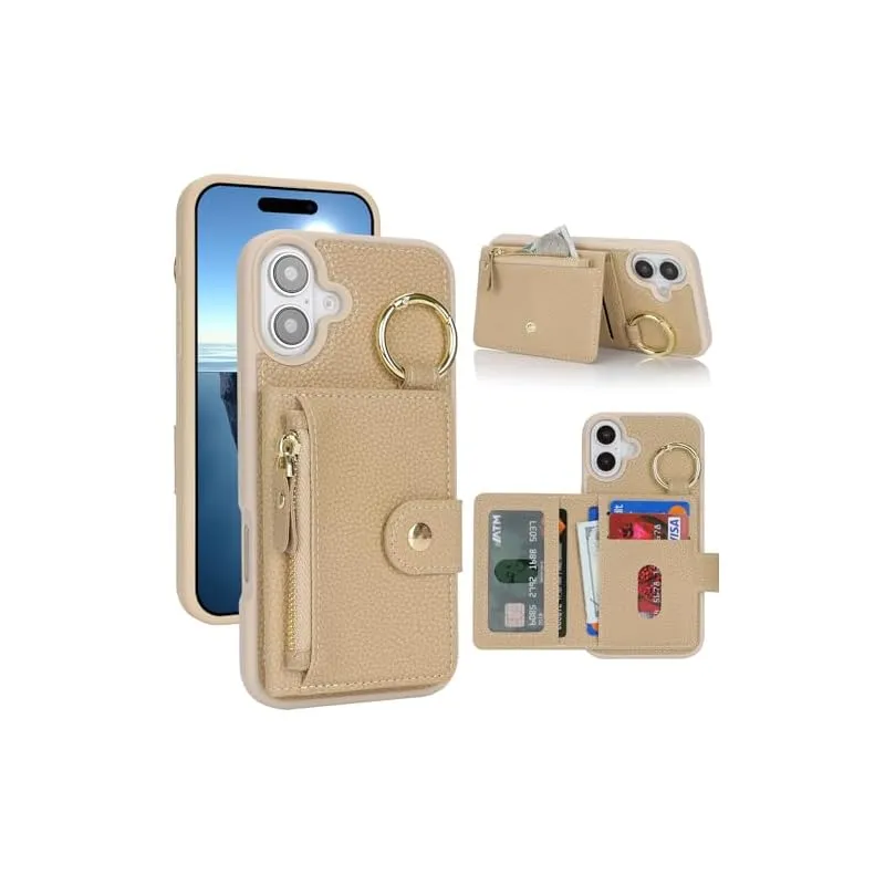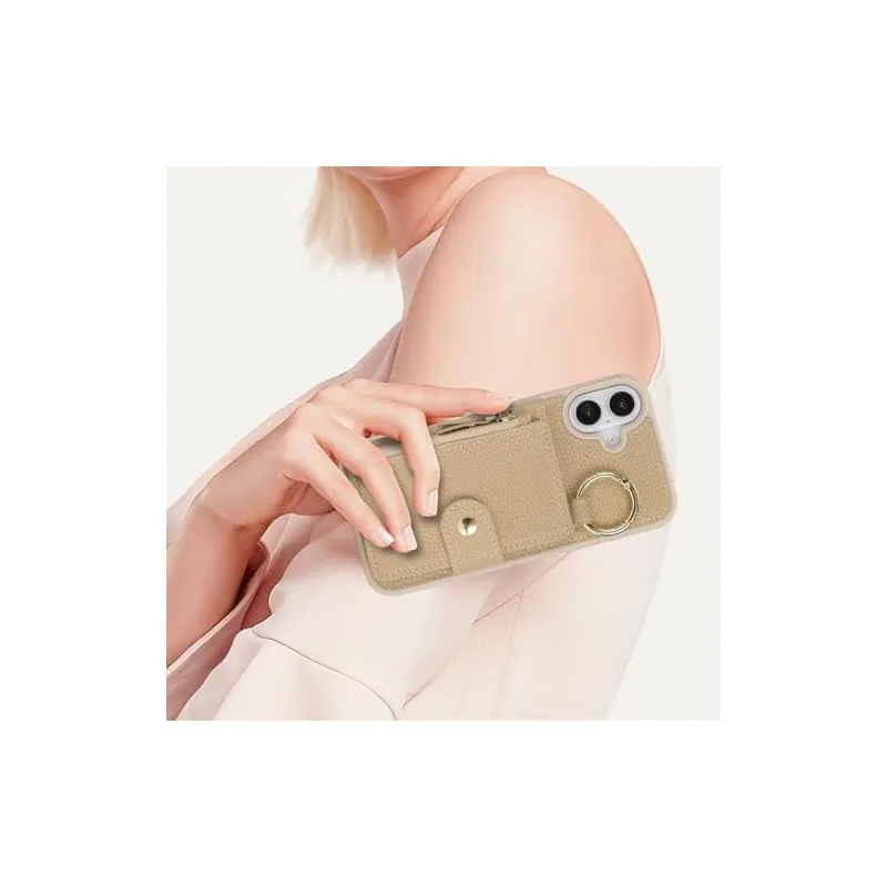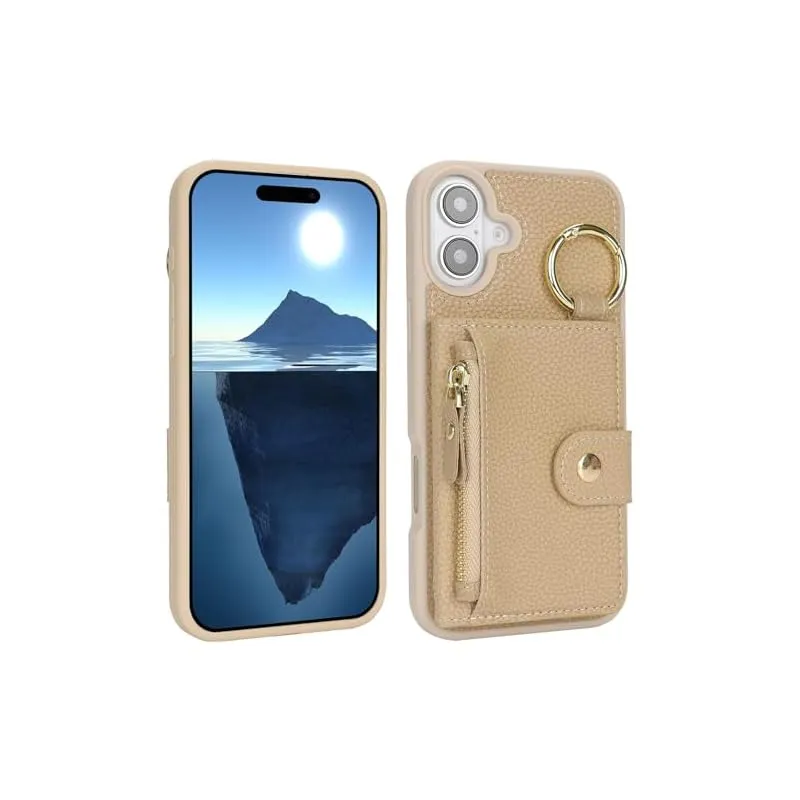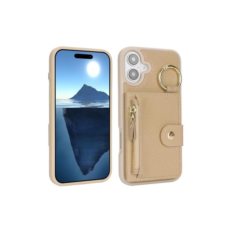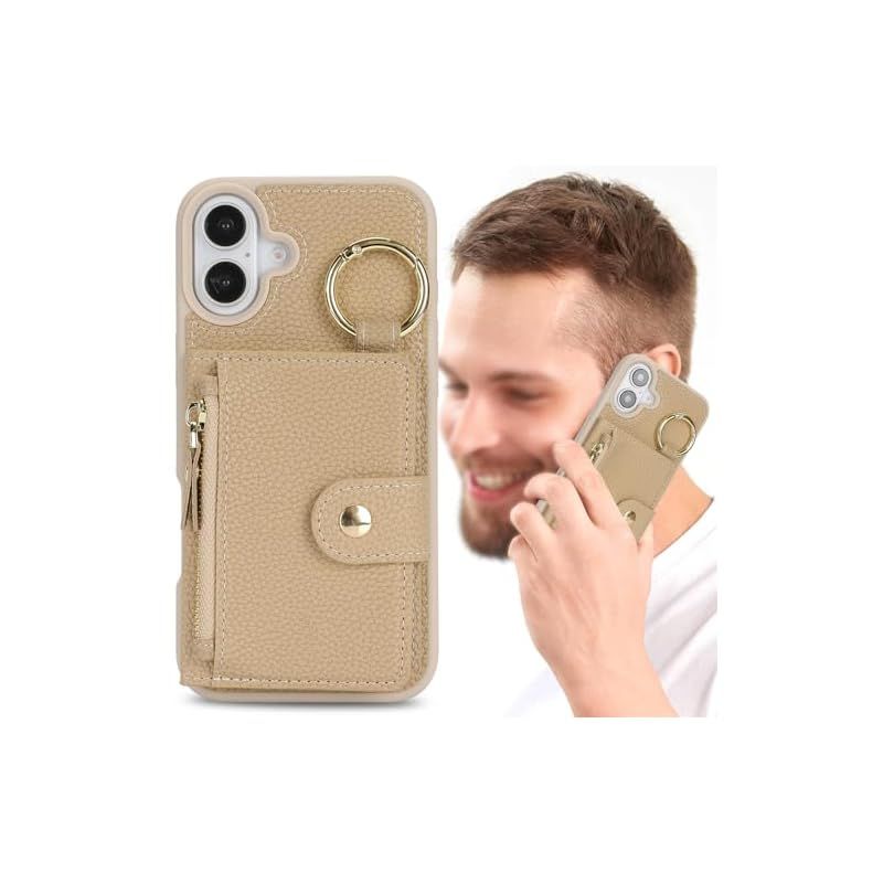【新品】 サイラーテック iPhone16 背面ケース 翻盖型 キーホルダー付クレジットカード入れ 女性用, アイフォン16 手帳ケース ライチ紋様 横置き機能 6.1in-ベージュ