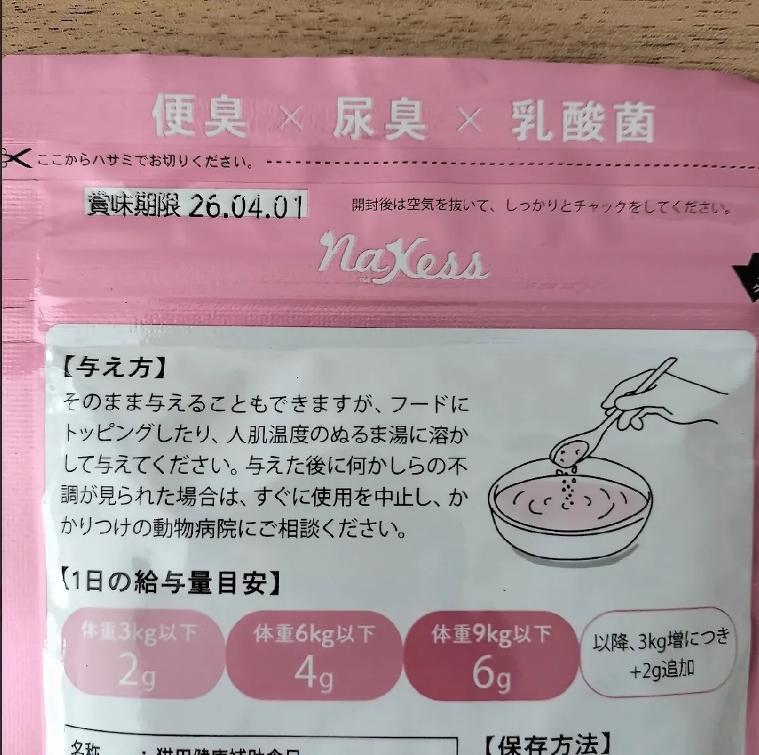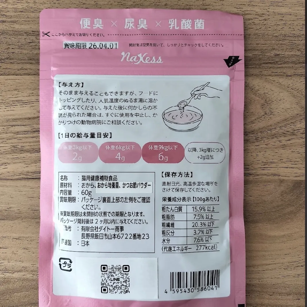【犬種サイズ】 すべて 最短2日で排泄物の臭いを40%軽減、独自のナノ型乳酸菌と有胞子性乳酸菌が腸内までしっかり届き、臭いの原因を根本から抑えます。 獣医師監修・完全無添加・ヒューマングレードの原料のみ使用、お腹が弱い子やシニア、子犬子猫にも安心して与えられます。 おからパウダーと国産かつおぶし粉末配合で食いつき抜群、粉末をフードに振りかけるだけで簡単に続けられます。 便秘や下痢、軟便も同時に改善、水溶性と不溶性の食物繊維をバランスよく配合し、毎日スッキリした健康的な便へ導きます。