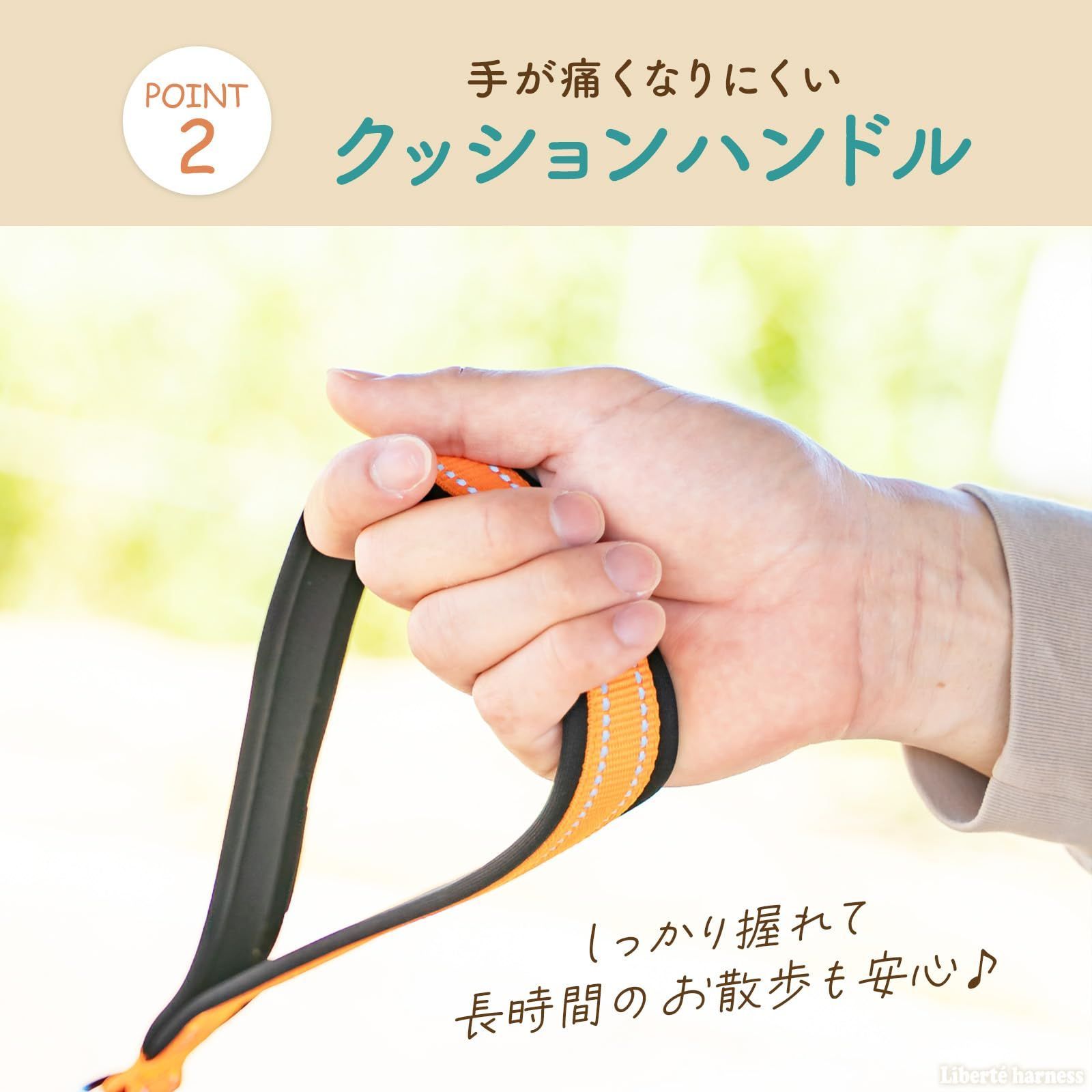 【長時間のお散歩も快適に】クッション入りのハンドルで手が痛くなりにくい。しっかり握れて滑りにくく、飼い主さんの負担を軽減します。